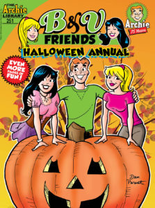 B&V FRIENDS HALLOWEEN ANNUAL #251When Betty makes her own stunning costume for the Riverdale High Halloween dance, Veronica’s sure that her BFF is going to win the costume contest—and she’s not about to let that happen! Can Veronica get the best costume that money can buy and win the contest away from Betty, or will she just end up getting the shaft? Find out in “The Costume Calamity,” the fun lead story to this Halloween-themed comics annual!