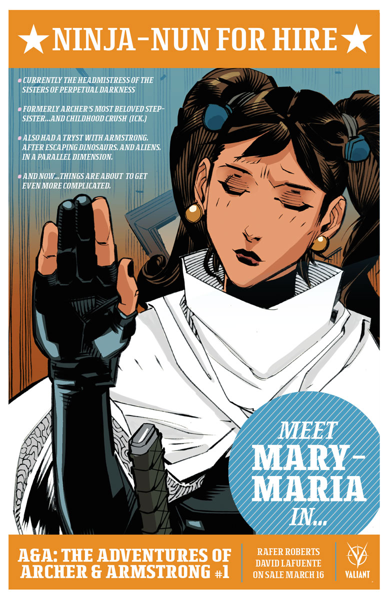 In advance of the 10th Annual ComicsPRO Membership Meeting in Portland, OR, Valiant is proud to debut the official animated trailer and an extended look inside for A&A: THE ADVENTURES OF ARCHER & ARMSTRONG #1 – the FIRST ISSUE of the ALL-NEW ONGOING SERIES from red-hot writer Rafer Roberts (Plastic Farm, Shutter) and Valiant-exclusive superstar David Lafuente (Ultimate Spider-Man)! On March 16th, get smashed or be smashed when Valiant’s award-winning adventurers go “IN THE BAG” for an insane rescue mission pitting Archer into the mind-bending maze of lost treasures and historical oddities that awaits inside Armstrong’s magical satchel! (Oh yeah, and there are some ninja-nuns, a talking fish-man, and a Greek god with a thirst for revenge too… It’s starting to get pretty rowdy in there!)