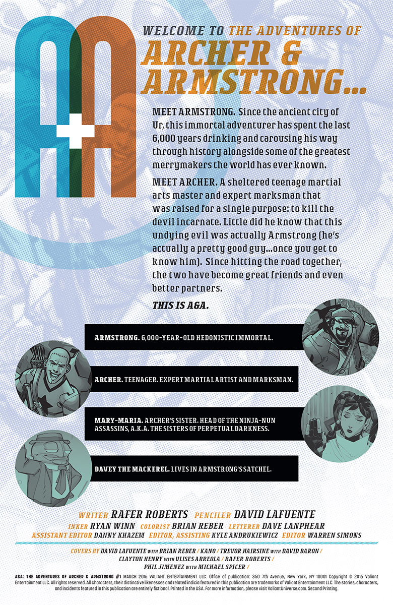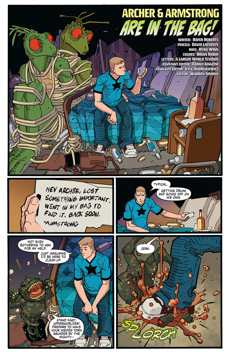 Then, jump into the adventures of Valiant’s (somewhat) dynamic duo with an all-out assault on the senses in A&A: THE ADVENTURES OF ARCHER & ARMSTRONG #1 – the FIRST ISSUE of Valiant’s next flagship series from red-hot rising star Rafer Roberts and superstar artist David Lafuente! The debut story arc – “IN THE BAG” – starts here on March 16th as Archer descends into the infinite depths of his partner’s bottomless satchel to rescue Armstrong from an age-old enemy…and battles his way through an upside-down world of arcane architecture, lost treasures, and strange creatures bent on making our world their own!