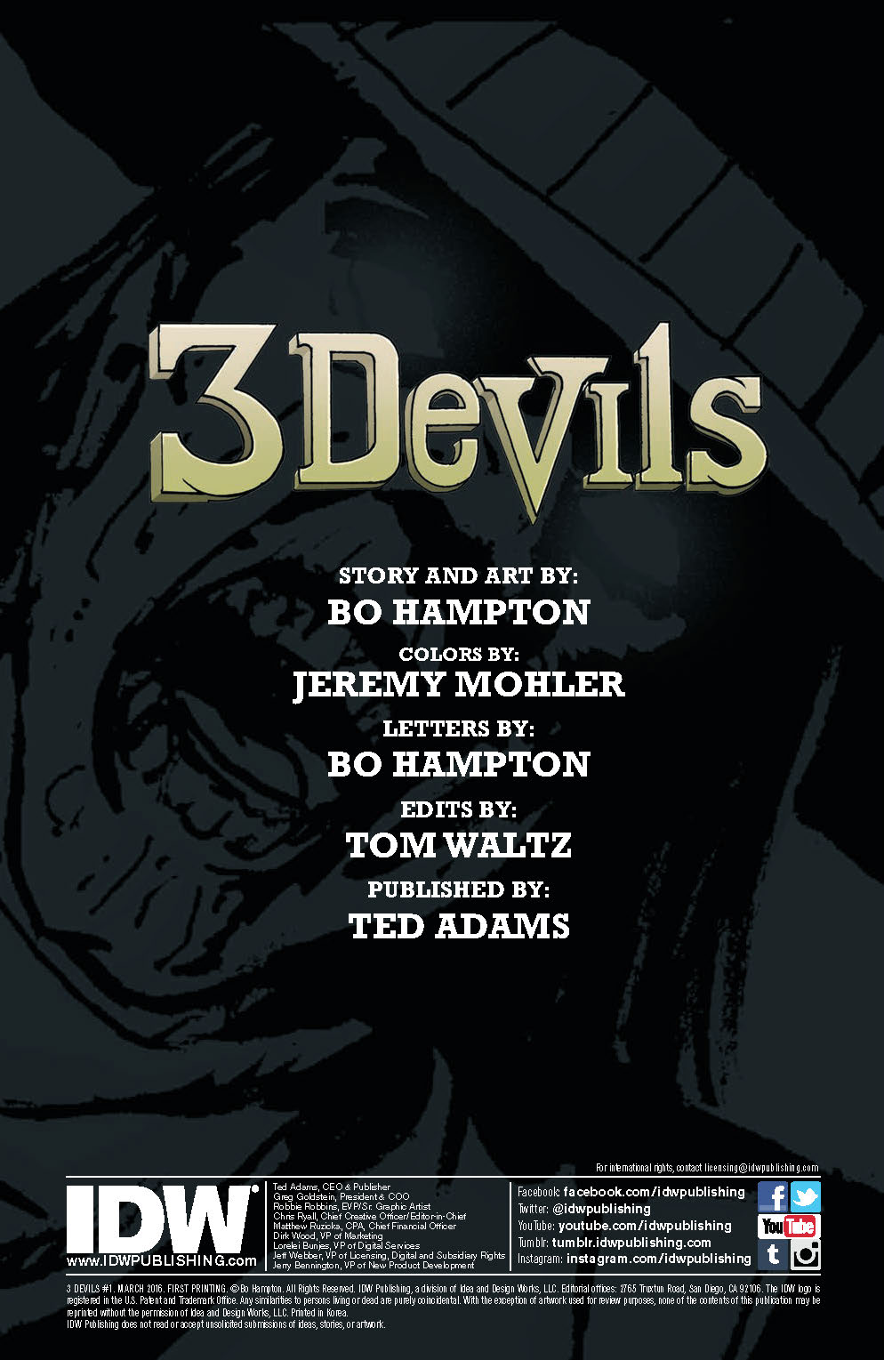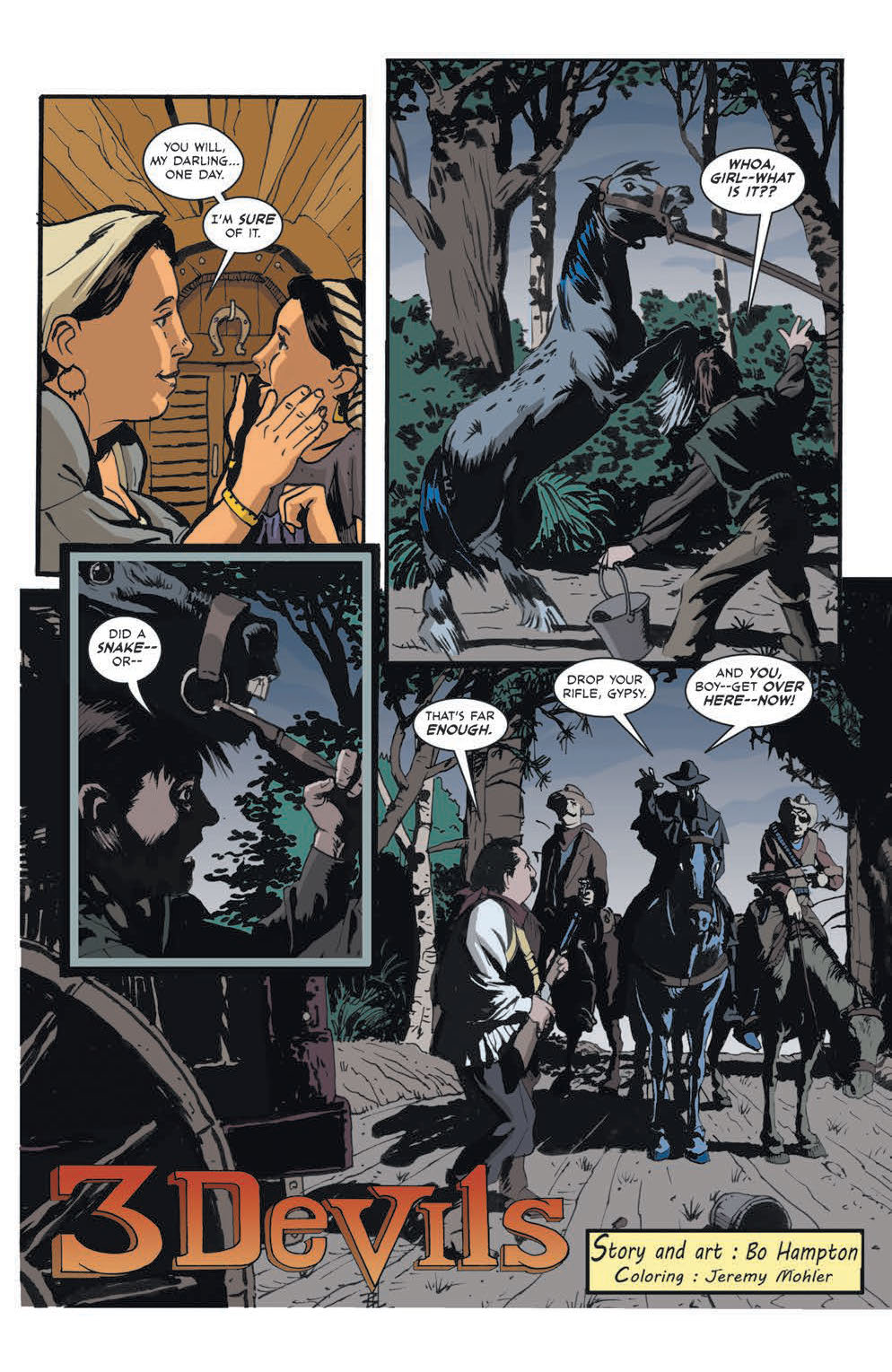 3 Devils, from writer/artist Bo Hampton, is a high-action, supernatural western that centers around a pact of vengeance sworn by a tragically orphaned Gypsy girl, an ex-slave with no soul, and a carnival freak billed as the Human Wolf. Gaining strength and courage from each other, they set off across the Old West—in search of the three hideous, inhuman entities that caused their torment and haunt their lives.
