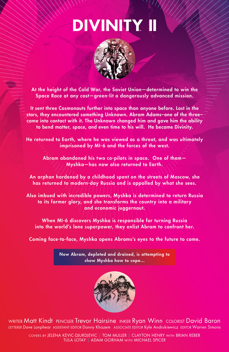 Myshka’s plot to reengineer the globe in Russia’s favor is all but complete. Will Abram Adams – the god-like being now called Divinity – stand against his former comrade…or, together, will they reshape the world as we know it with hammer and sickle in hand?