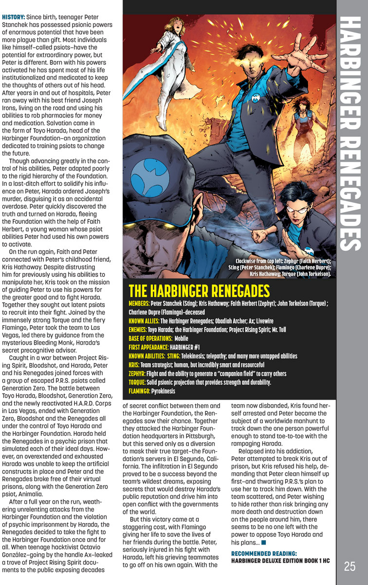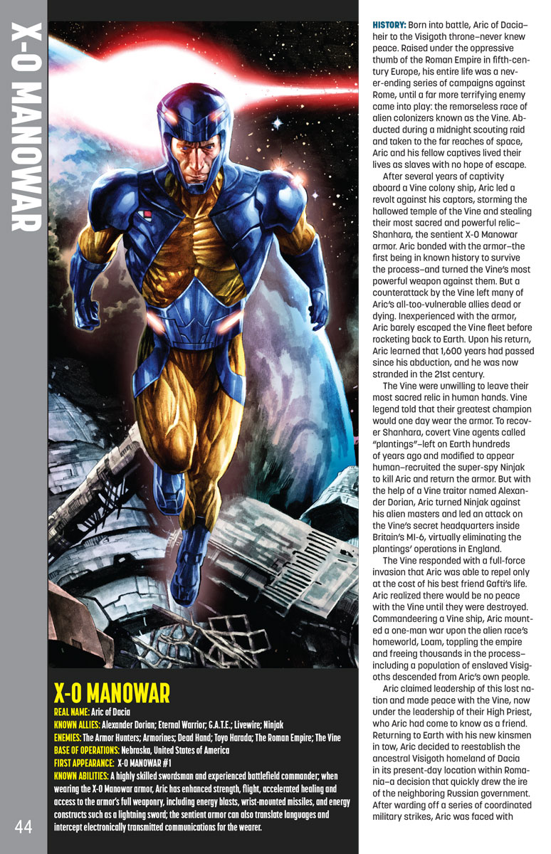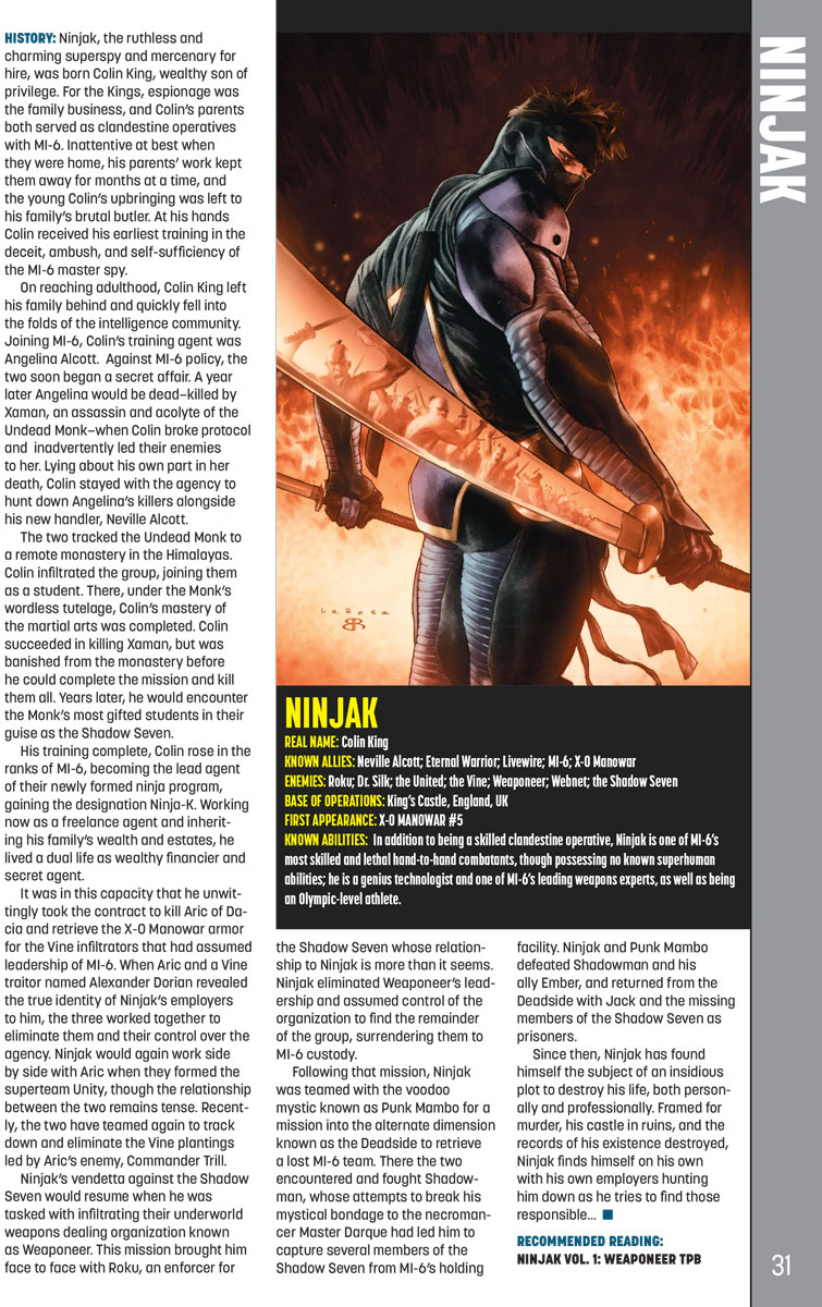 Jump on board here to discover the staggering scope and epic scale of the largest independent universe in comics! Featuring complete dossiers on Valiant powerhouses like BLOODSHOT, THE ETERNAL WARRIOR, FAITH, NINJAK and RAI alongside newcomers like DIVINITY, IMPERIUM, PUNK MAMBO, and THE SHADOW SEVEN – plus never-before-seen explorations of far-flung locales like 4001 A.D. and THE DEADSIDE – this essential, oversized handbook is your one-stop introduction to the most acclaimed publishing line in comics! Featuring artwork from a blockbuster cast of superstar artists including Doug Braithwaite, Clayton Crain, David Lafuente, Lewis LaRosa, Trevor Hairsine, Mico Suayan, and many more!