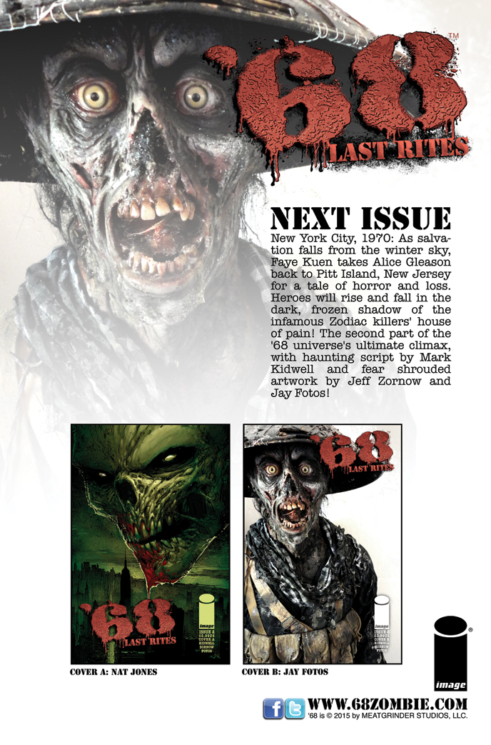Set in New York City, 1970, ’68 LAST RITES #2 hit shelves just last week. As salvation falls from the winter sky, Faye Kuen takes Alice Gleason back to Pitt Island, New Jersey for a tale of horror and loss. Heroes will rise and fall in the dark, frozen shadow of the infamous Zodiac killer’s house of pain! The second part of the ’68 universe’s ultimate climax, with a haunting script by MARK KIDWELL and fear-shrouded artwork by JEFF ZORNOW and JAY FOTOS! – See more at: https://imagecomics.com/