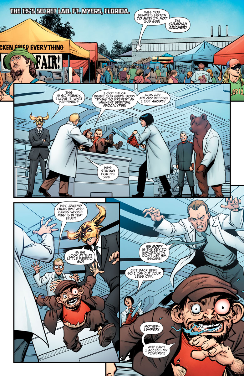 Obadiah Archer: Skilled marksmen, trained fighter, and…deranged circus freak?! Through the unfathomable forces of nature, Archer and Gub Gub – the pint-sized and deranged clone of Armstrong – have swapped minds! When Gub Gub’s body is kidnapped by nefarious forces, Armstrong and his long-lost wife, Andromeda, must race to save their friend and undo the horrendous merger of minds before the damage becomes permanent!