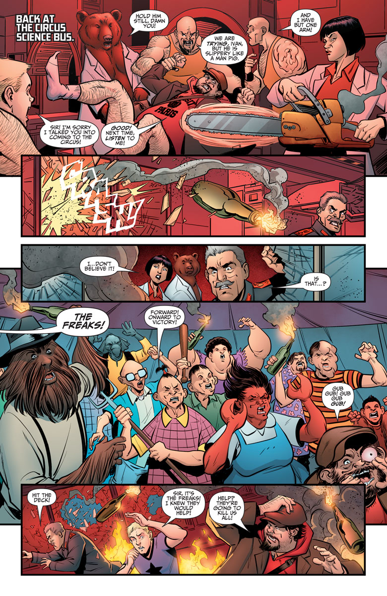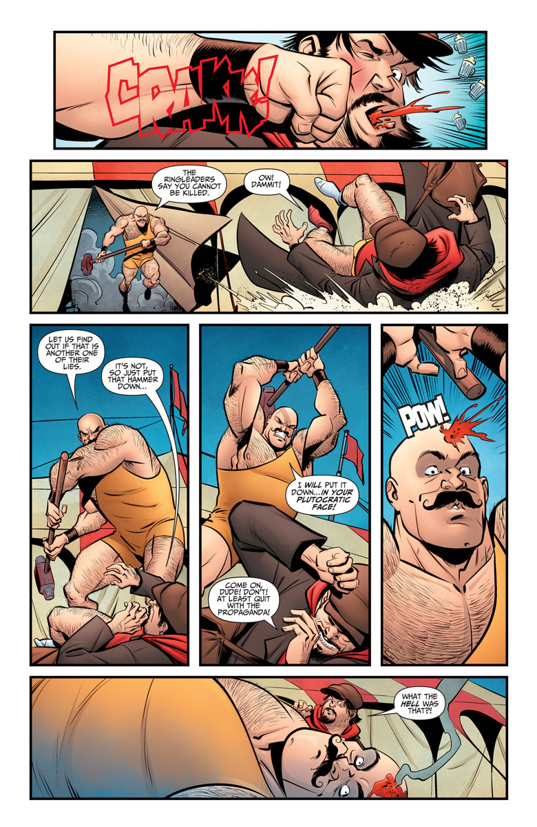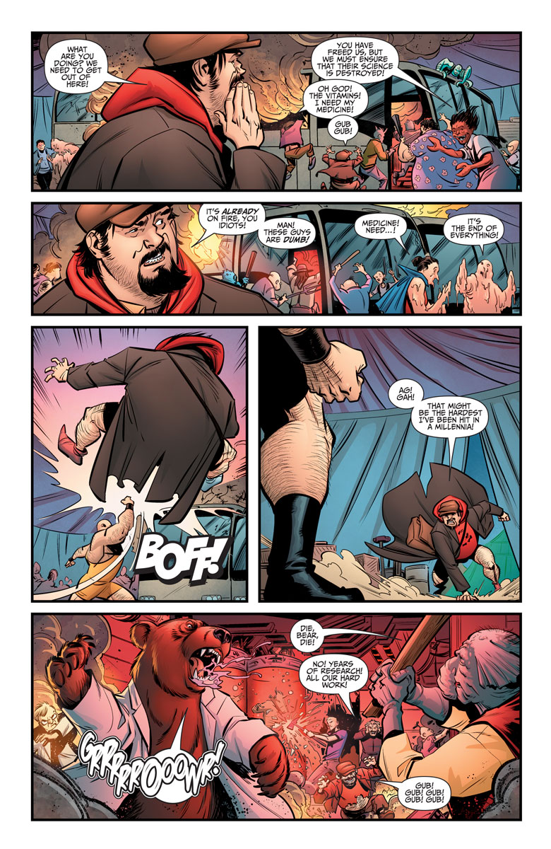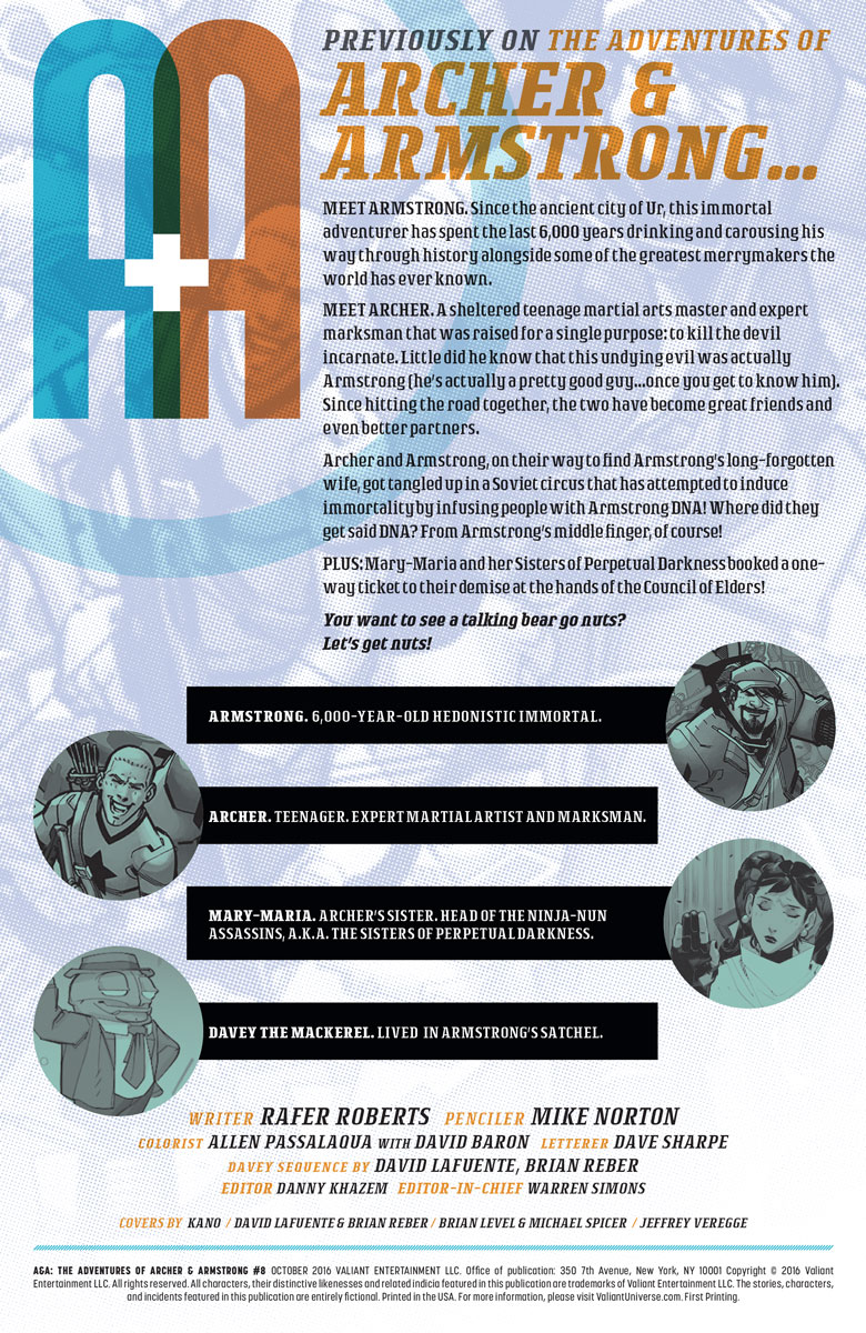 Archer & Armstrong. Fearless adventurers. Best friends. Better partners. But that was before this traveling circus made them prisoners of a sideshow so freakish, it makes Davey the Mackerel look like the girl next door! Now captives beneath the world’s maddest midway, our fearless(ish) heroes are just steps from the final clue to locating Armstrong’s long-lost wife… Too bad there’s a literally “small” army of deranged and dangerous Armstrong clones protecting it with all of their miniature might! Meanwhile: Mary-Maria must confront the one force capable of putting her in her place – the Council of Elders! And whatever happened to Davey, anyway?