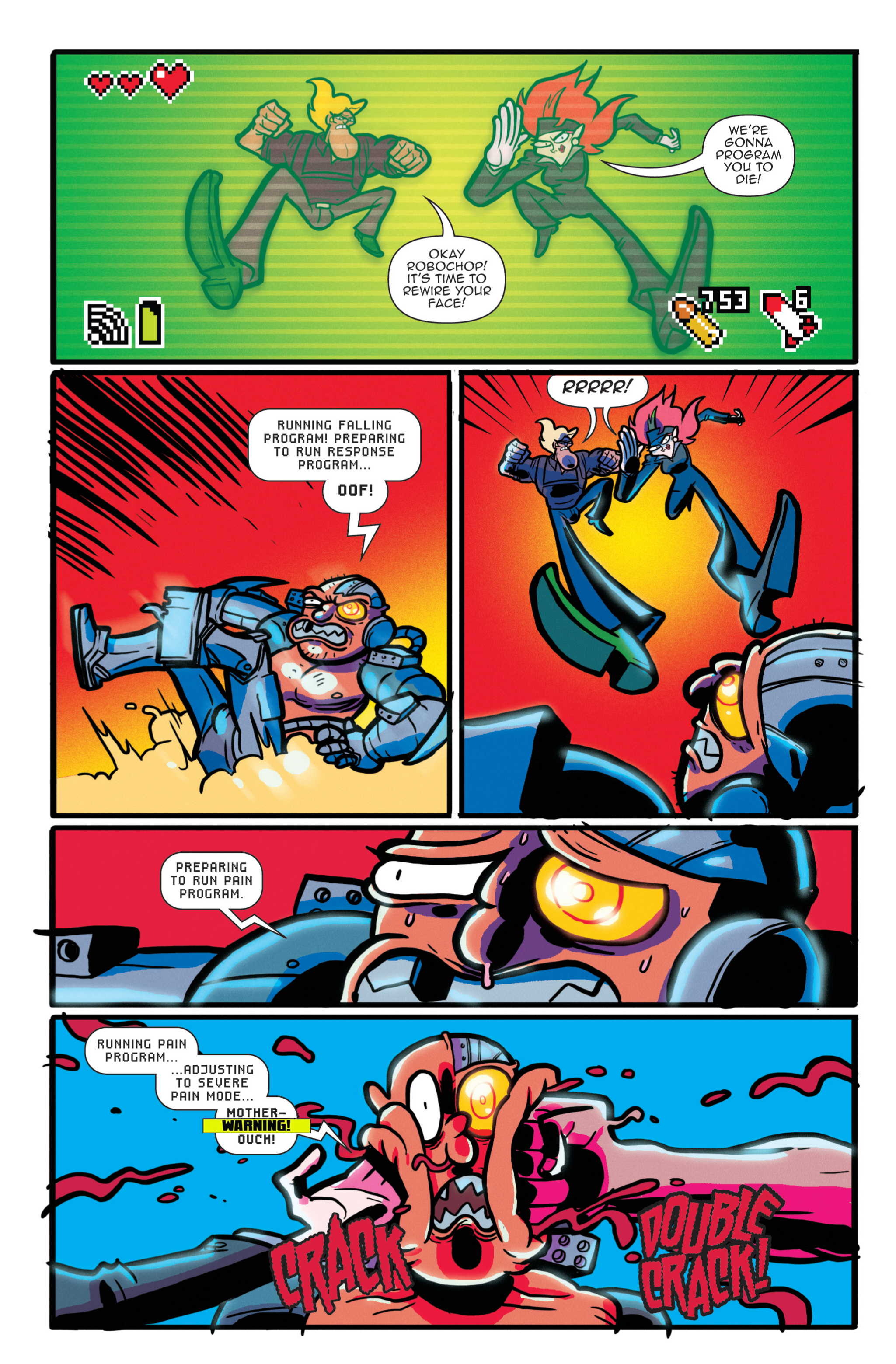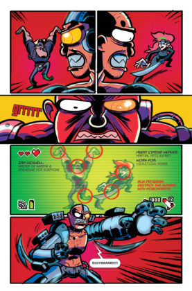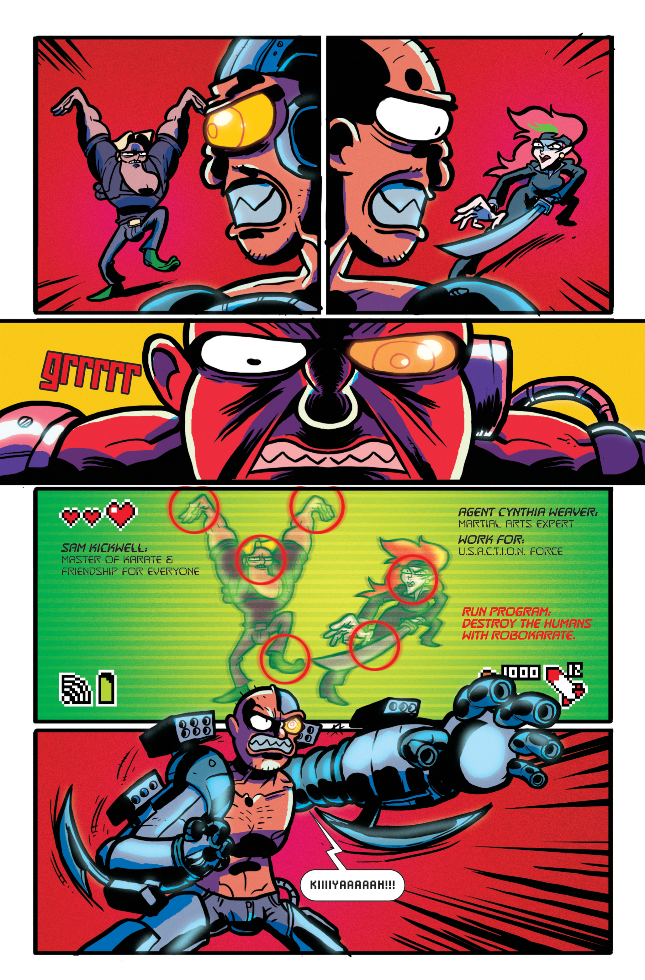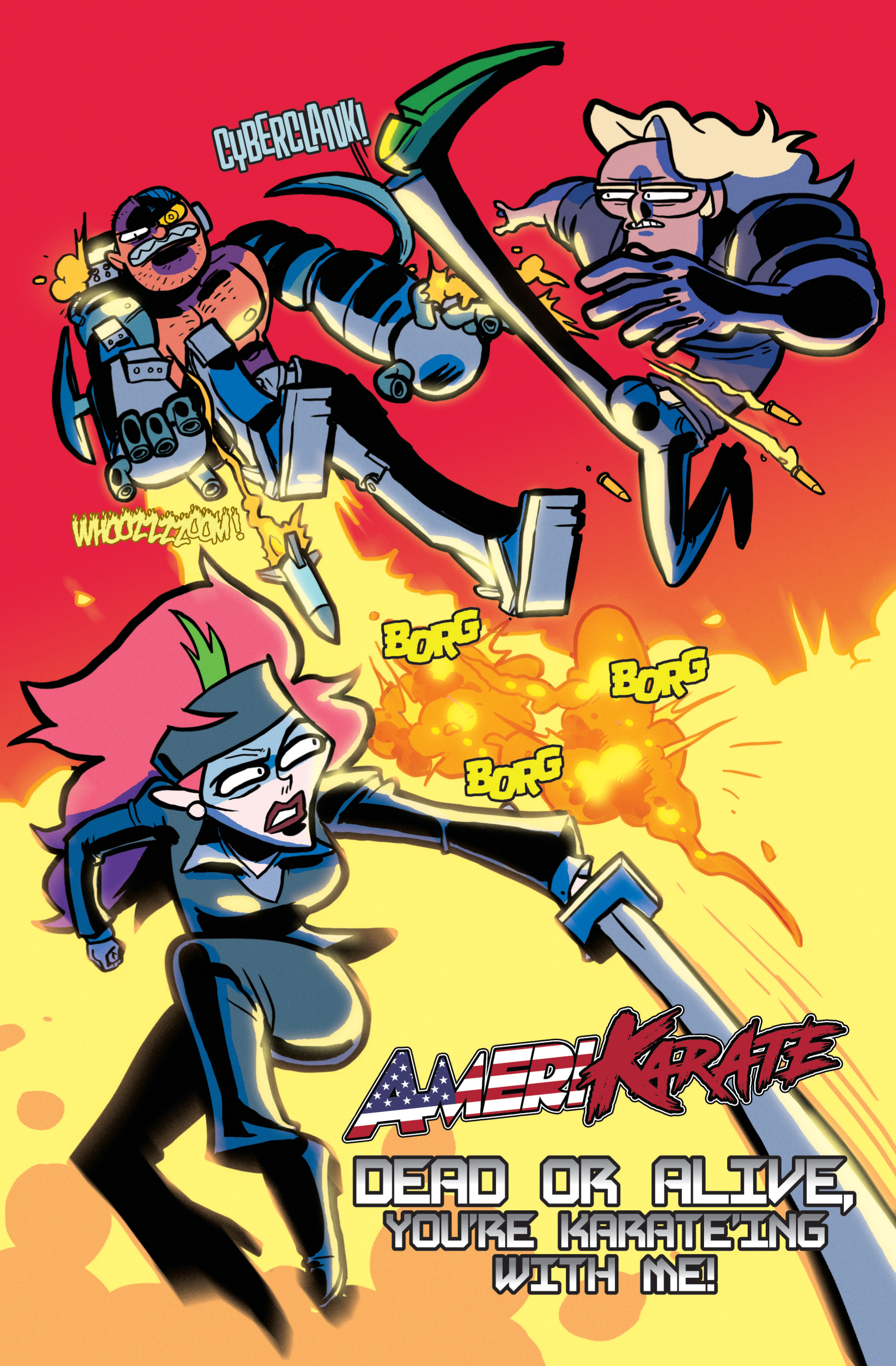 Roll over, RoboChump, there’s a NEW cyborg in town! Cynthia and Sam finally confront the mastermind behind the cybertheft crime wave that has left the city’s knees shaking in its city-boots —but the shocking revelation of who it is shocks their karate-socks off! It’s robo-kills versus karate-skills the most action-packed issue of the comic book that critics are calling “the most action-packed yet!”
