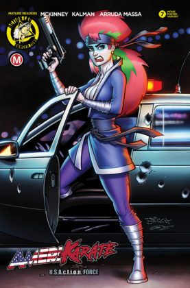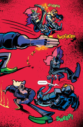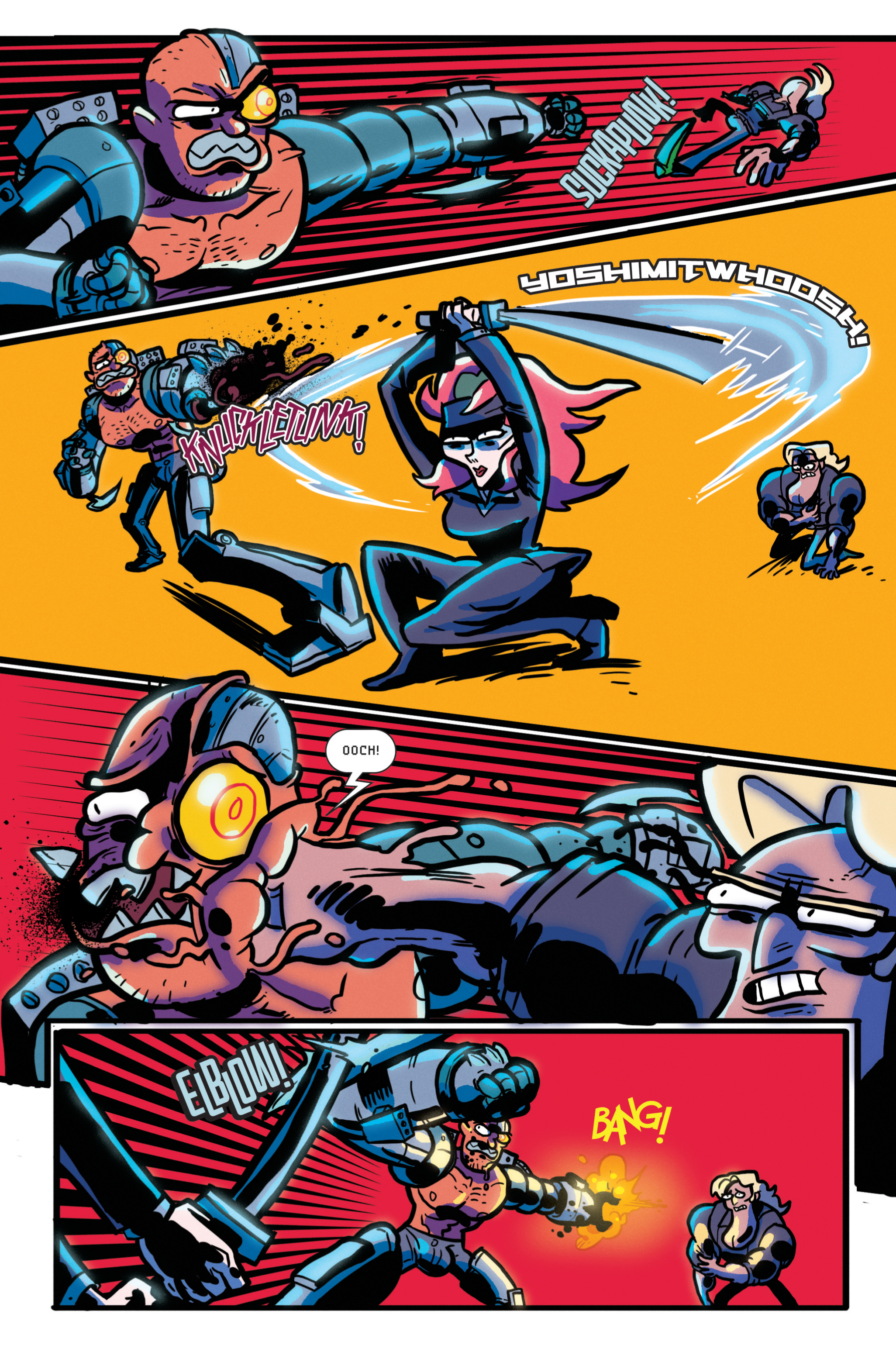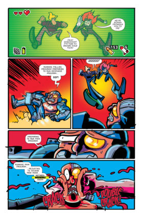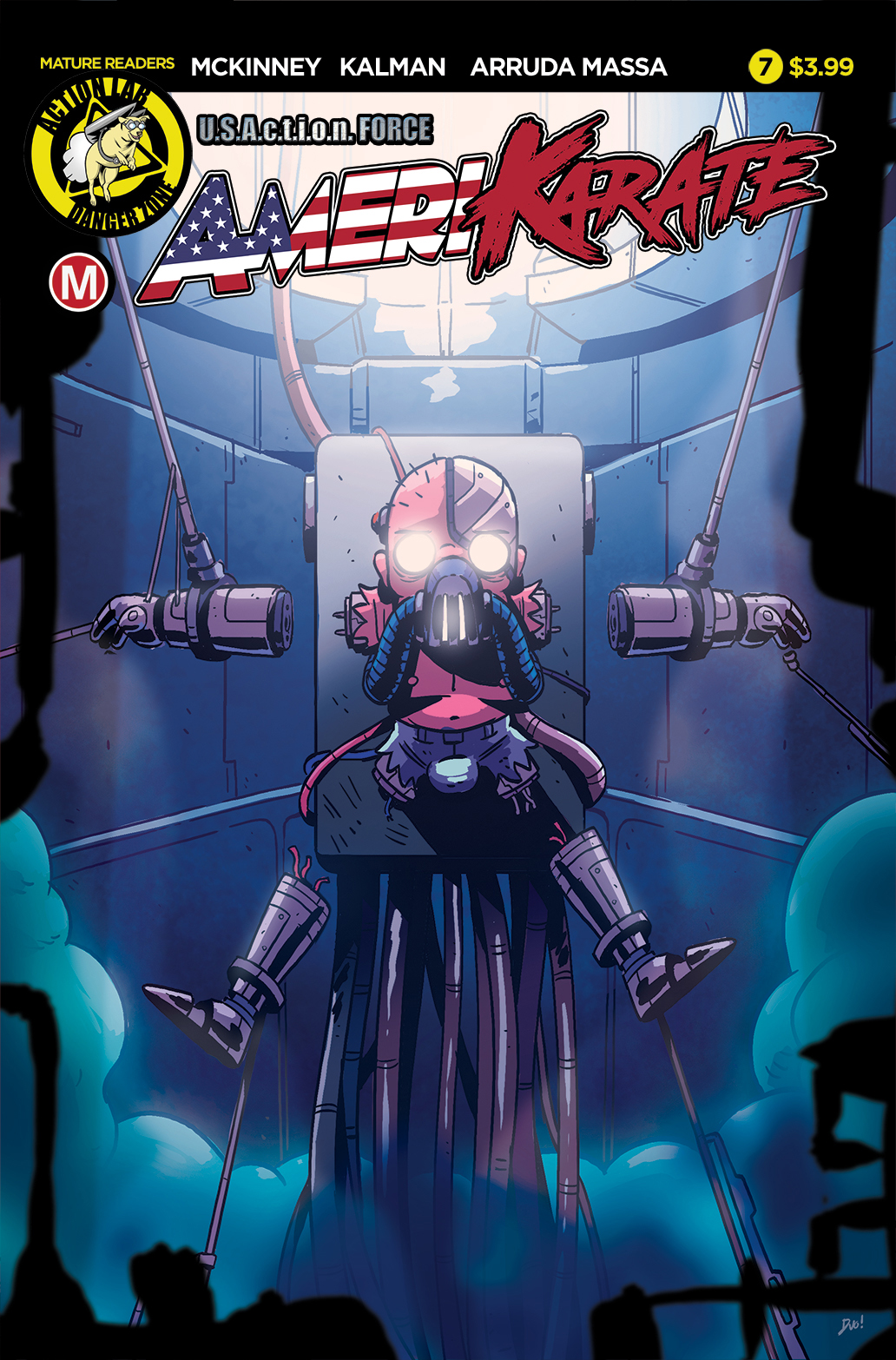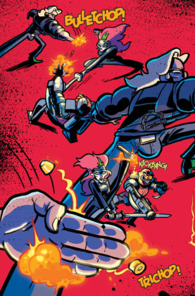 Roll over, RoboChump, there’s a NEW cyborg in town! Cynthia and Sam finally confront the mastermind behind the cybertheft crime wave that has left the city’s knees shaking in its city-boots —but the shocking revelation of who it is shocks their karate-socks off! It’s robo-kills versus karate-skills the most action-packed issue of the comic book that critics are calling “the most action-packed yet!”