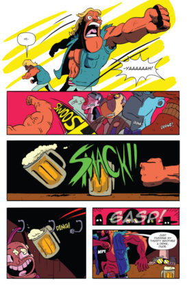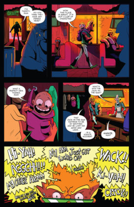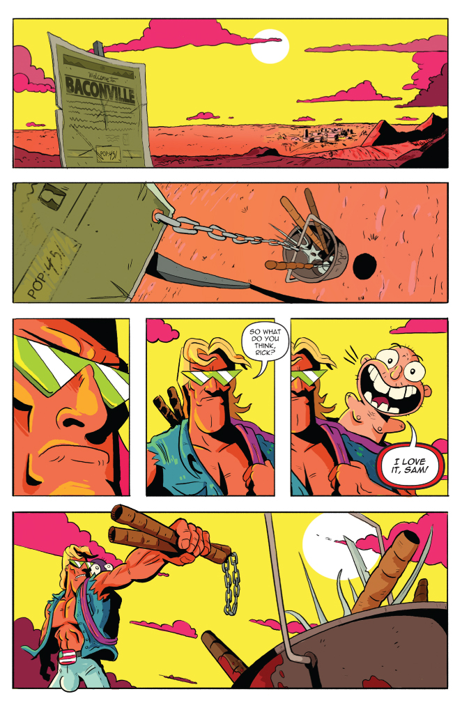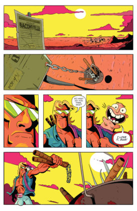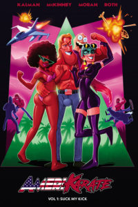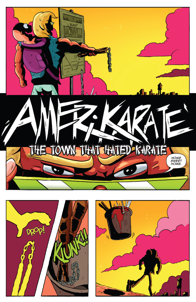 AmeriKarate is the story of Sam, a war hero who wants to lead a normal life, but is thrust into protecting America from an evil ninja invasion. When he meets a fellow karate fanatic in the form of CIA agent Cynthia Weaver, the chemistry can be cut with a katana! Will they be able to overthrow the megalomaniacal super-ninja, Neon… or will their sparks ignite a karate-fire that will consume them both?! Collects issues #1-4 of the hit series!