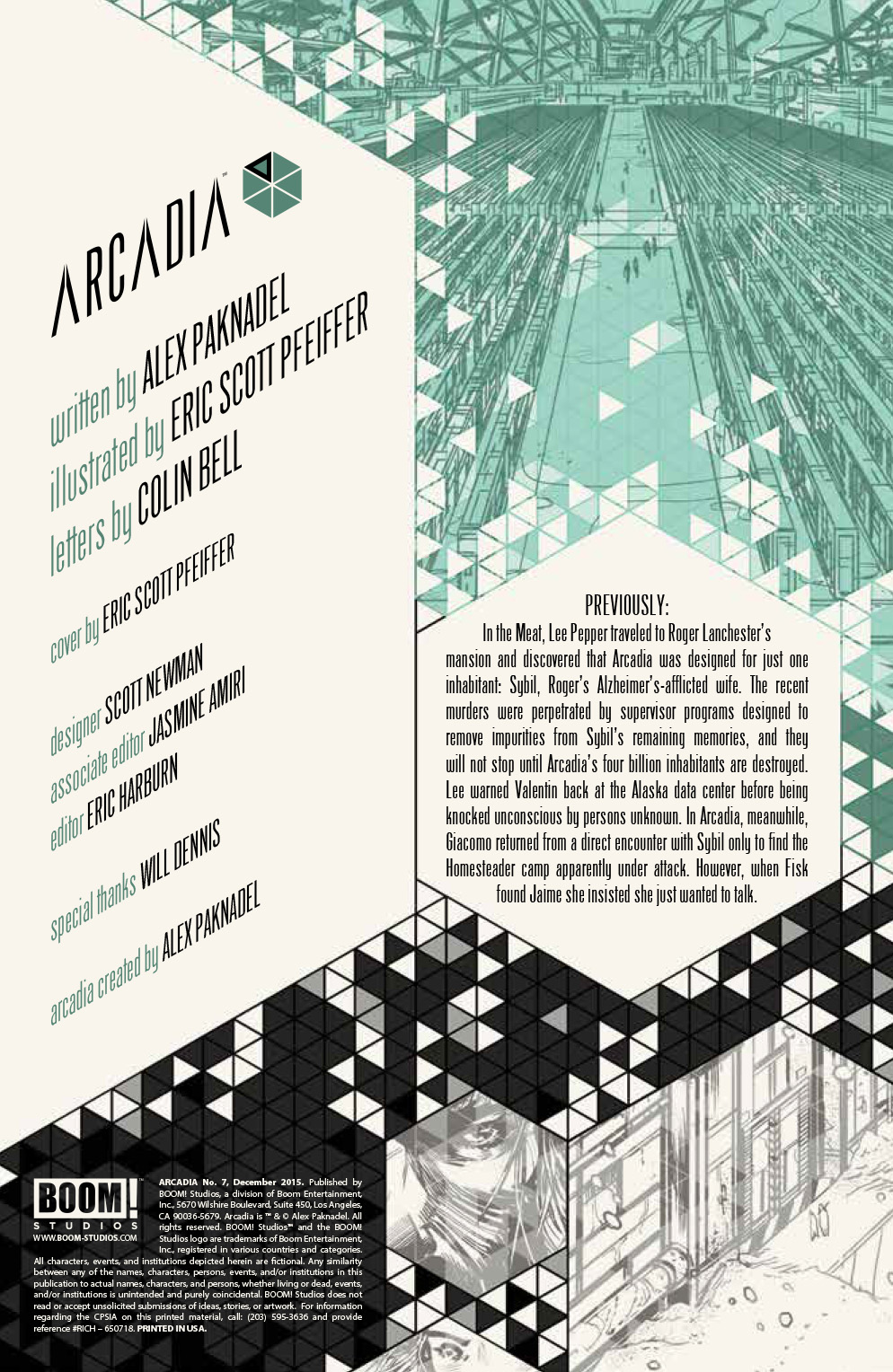 PreviewsBOOM! Studios Previews Arcadia #7 By Comix Asylum - Dec 21, 2015 0 556 FacebookTwitterPinterestWhatsApp Arcadia #7 Writer: Alex Paknadel Artist: Eric Scott Pfeiffer In Arcadia, Lee Garner gives someone a “factory reset,” while people at Arcadia Base Station One begin falling ill in the face of a new viral onslaught. Arcadia #7 1 of 7