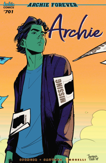 A brand-new era of ARCHIE begins in this landmark 700th issue of our flagship series! Join the new creative team of writer Nick Spencer (The Amazing Spider-Man) and artist Marguerite Sauvage (DC’s Bombshells) as they take a trip to Riverdale and bring Archie, Betty & Veronica, Jughead, and the rest of the town along for a wild ride complete with new mysteries, new relationships, and much more!