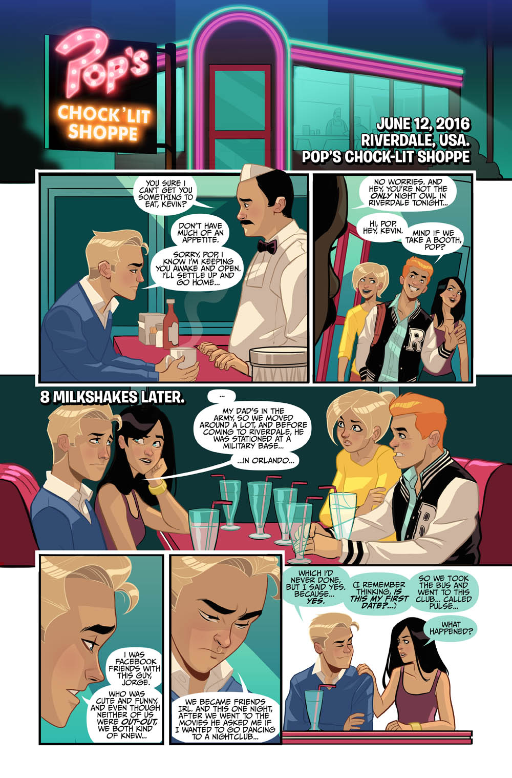 “It had to be in the more modern ‘New Riverdale’ style and obviously include our openly gay character, Kevin Keller. Marc then paired me with the supremely talented Stephen Byrne, who delivered gorgeous art. We often talk about how ‘Riverdale’ exists in the real world today, so we’re incredibly honored to be paying our respects to the terrible tragedy that happened in Orlando, along with so many of our colleagues in the industry.”
