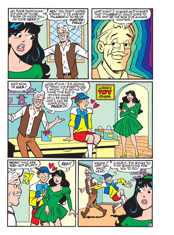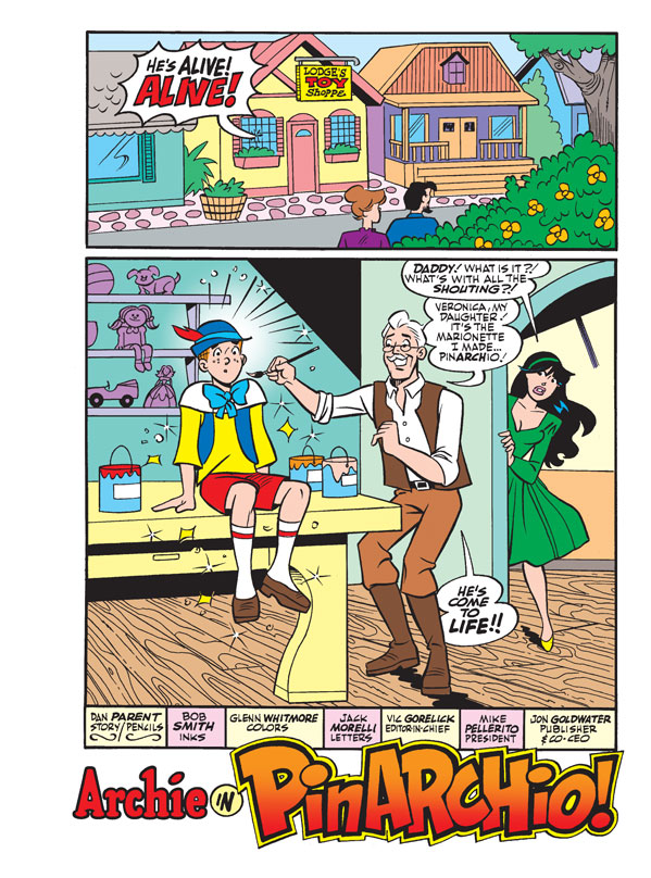 It’s STORYBOOK MONTH for the Archie digest line! In “PinARCHIo,” Mr. Lodge creates a puppet, PinARCHIo, that comes to life. But the new boy is so girl crazy and so disobedient, he tries to get him back into puppet form!