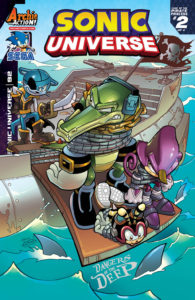 SONIC UNIVERSE #92ENTER the DEPTHS of DANGER in “The Case of the Pirate Princess” Part Two: The Chaotix have tracked down the princess of Meropis and the pirates that kidnapped her – but now they’re prisoners as well! And Vector’s daring plan to escape… is to join them?! It’s mysteries and revelations galore as the Chaotix hit the high seas! Featuring cover art by Sonic comics veteran Tracy Yardley and a “Shinobi” variant by monster-talent T-Rex!