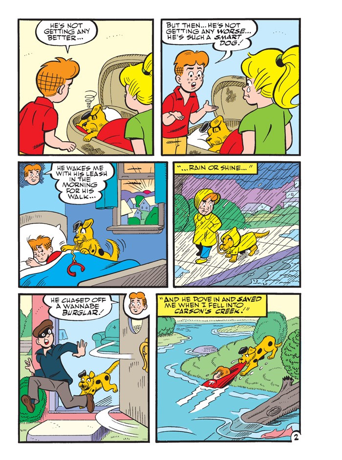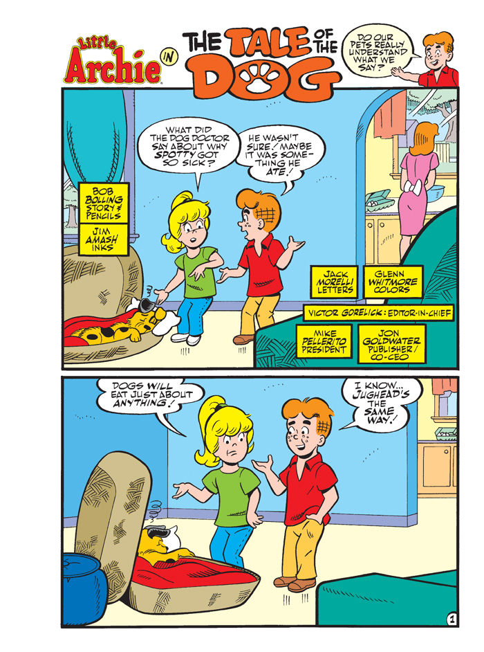 Spotty, Little Archie’s dog, becomes unexplainably sick and stays that way until he hears Little Archie reminiscing about him with Little Betty—especially when he hears Betty suggest that Archie might need a cat like her Caramel for company! This storybegs to answer the question: Do our pets really understand what we say? Find out in “Tale of the Dog!” the fun, new lead story to this summer annual featuring even more pages of fun!