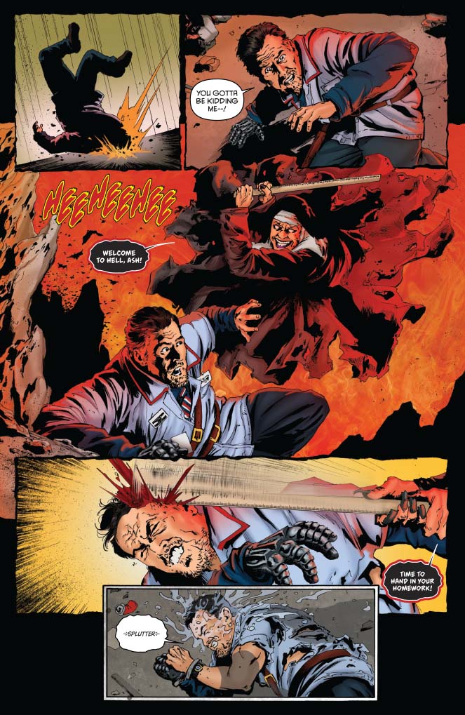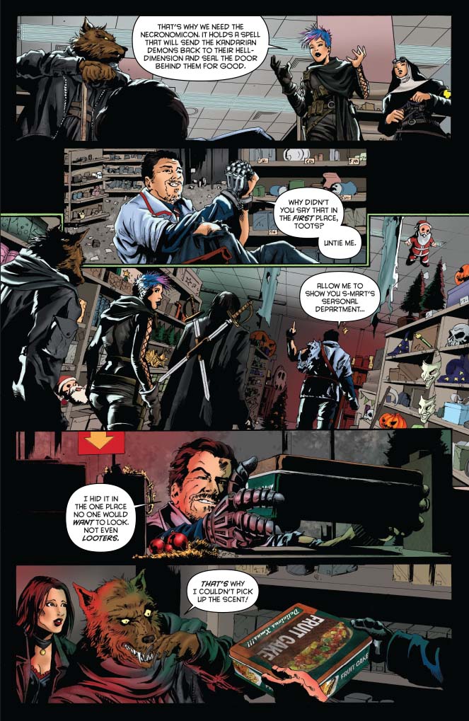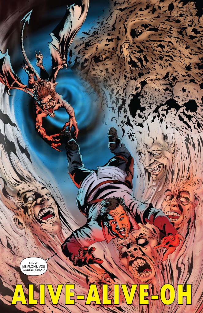 Twenty years from now, the world has fallen to the Deadite invasion. The remains of civilization is holed up in what was once the city of Lansing, Michigan — now renamed simply “Alive.” It is up to the Chosen One, the Keeper of the dread Necronomicon Ex Mortis, a.k.a. Ashley “Ash” Williams, and a rag-tag group of humans and monsters — including the Daughter of Dracula, Frankenstein’s Monster, and the witch Heckuba — to save humanity and send the Deadites back to Hell. But to do that, they must first battle their way past Ash’s evil twin, The General, and his demonic Army of Darkness with the help of a werewolf biker gang, Dracula and his Brides, and Ash’s custom Murder-Mobile.