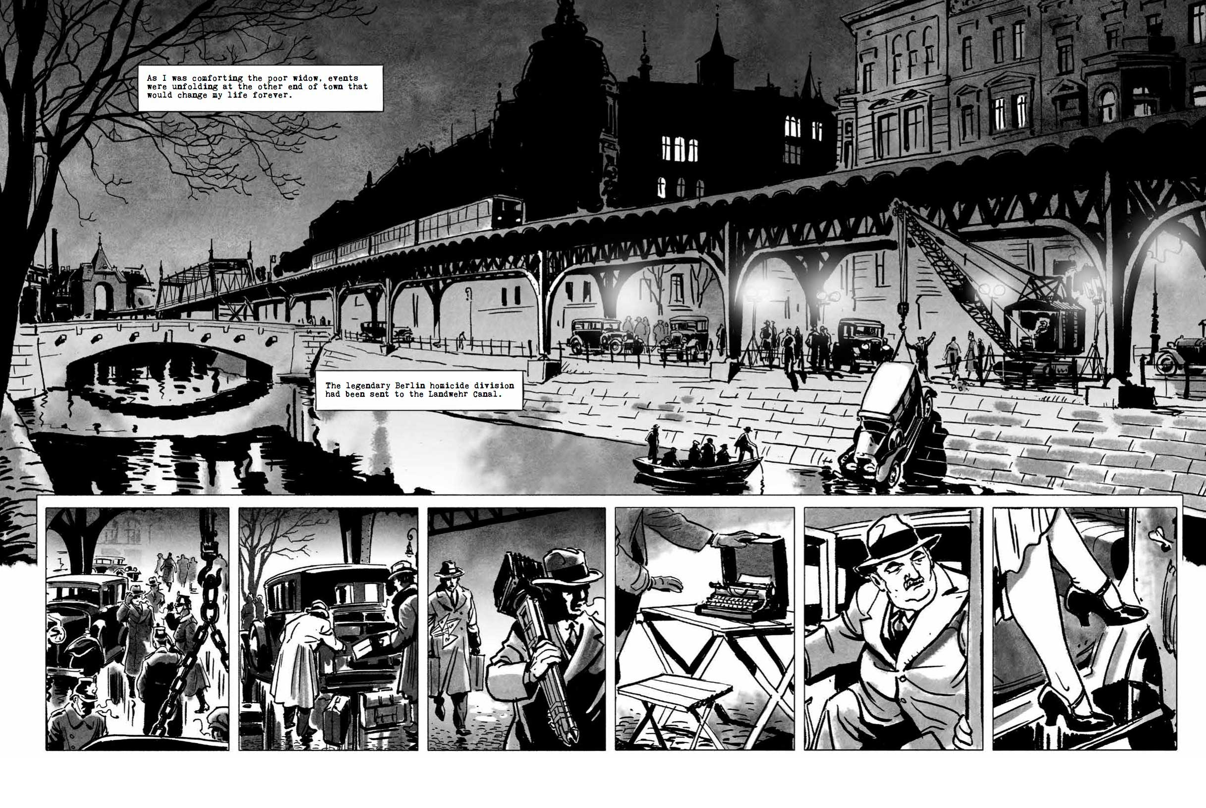 I had to find the heart of the original and decided to show the story from the point of view of the protagonist. That resulted in one of the main alterations that I invented during the transformation: The first-person narrator. I wanted to keep as many of the iconic, impressive scenes from the novel, I wanted to hit the correct motivation, the soul of the characters. Of course, there are many differences to the novel, but only when I thought it would help to dramatize and shorten the visual narration. I think the connoisseur of the original novel will have as much fun with the comic book version as the one who doesn’t know the original. It’s interesting to compare the TV series to my adaptation and the changes we both did during the interpretation. There are quite a few similarities in the changes, which seem to be obvious when you transform Kutscher’s story to a visual medium.