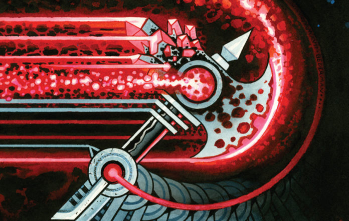 “A screaming black hole feedback squall of death metal Kirby-kozmik energy spinning straight towards your prefrontal cortex. Donny Cates and Ian Bederman forge a stylish, super-heavy 21st-century mythology of blood, sentient steel, and rebel circuitry. A razor-nova of explosive writing and searing visuals that bury themselves deep in your skull. ATOMAHAWK REX!” —Grant Morrison