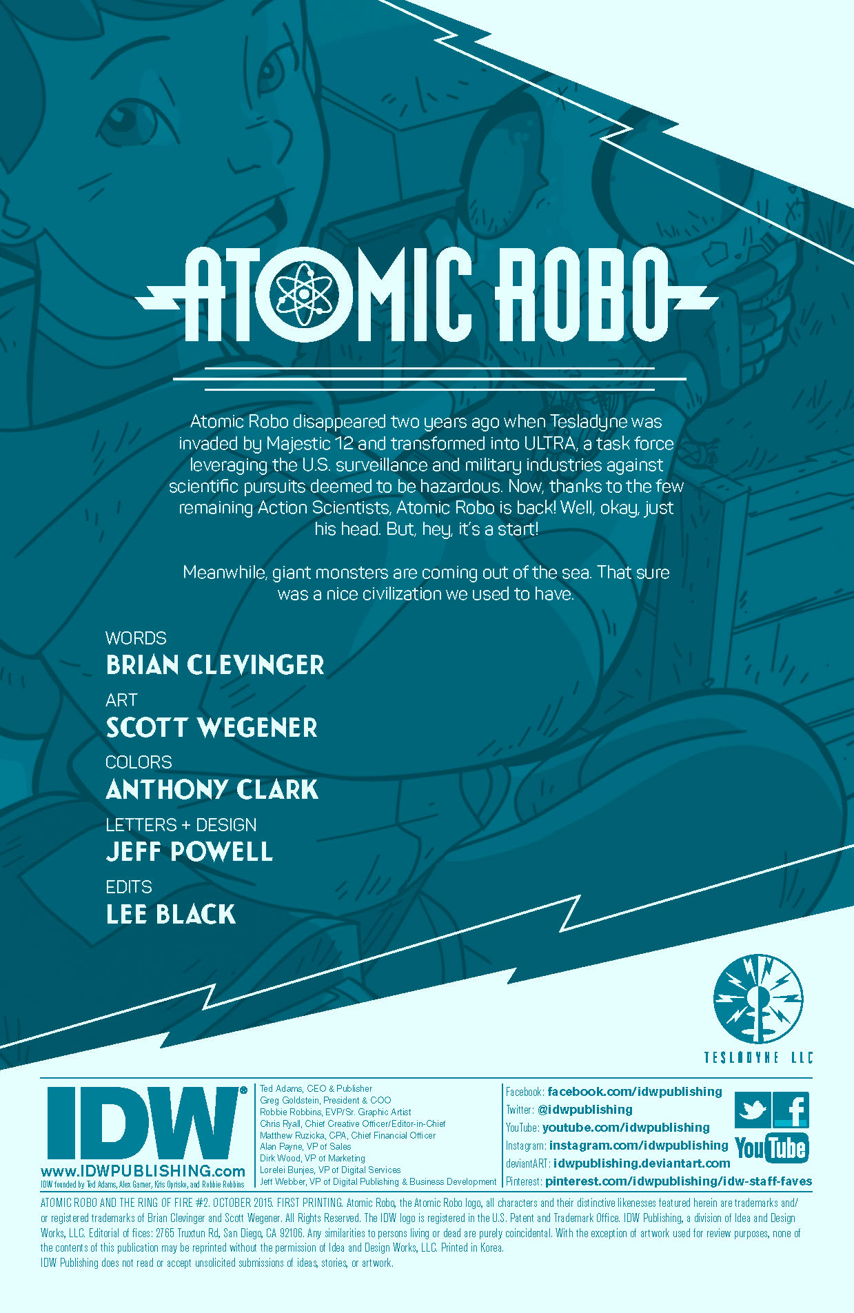 PreviewsIDW Comics Atomic Robo and the Ring of Fire #2 By Comix Asylum - Oct 4, 2015 0 603 FacebookTwitterPinterestWhatsApp Atomic Robo and the Ring of Fire #2 (of 5) Brian Clevenger (w) • Scott Wegener (a & c) Atomic Robo’s head is discovered and a new style of bowling is founded. Also: monsters threaten all life on earth! FC • 32 pages • $3.99 Atomic Robo and the Ring of Fire #2 1 of 7