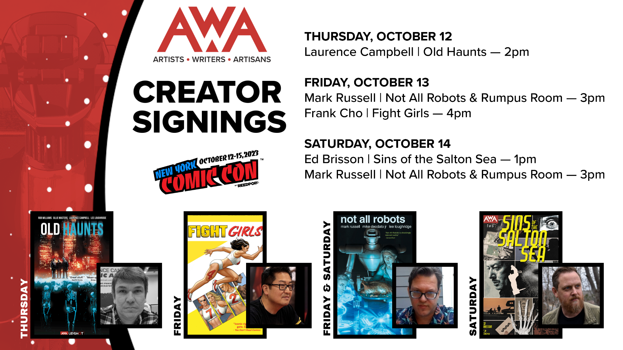 - Talent Signings at the AWA Booth – During the first three days of the Con, AWA is holding talent signings at its booth (#3456) with fan-favorite writers and artists including: