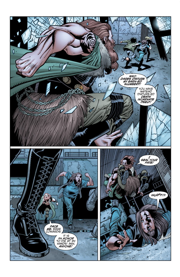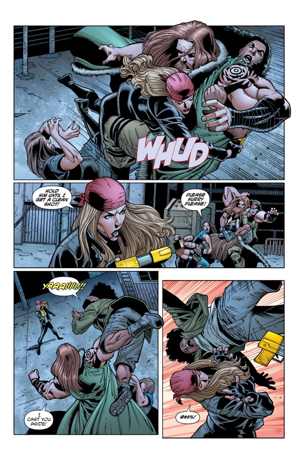Bounty hunter Barb Wire goes after the lion in its lair when she confronts the drunken powerhouse named Wyvern Stormblüd in his squat—a decaying steel mill almost as hazardous as he is. It’s a battle between the swift and smart and the ’faced and ferocious!