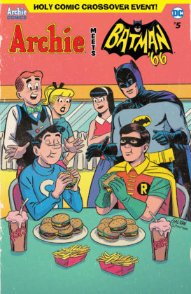 ARCHIE MEETS BATMAN ’66 is a six-issue crossover with DC Comics written by Batman ’66 scribe Jeff Parker and Michael Moreci, with art by Dan Parent, inker J. Bone, colorist Kelly Fitzpatrick, and letterer Jack Morelli. When Gotham City’s villains (as seen on the classic Batman TV series) infiltrate Riverdale, two pop culture icons collide!