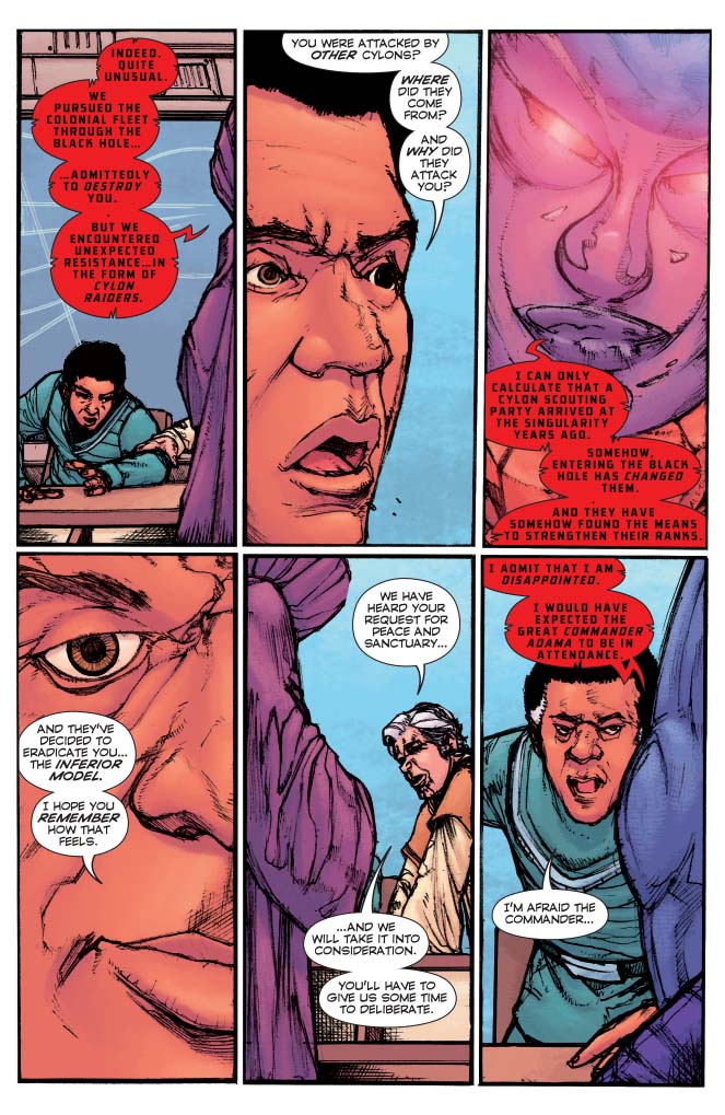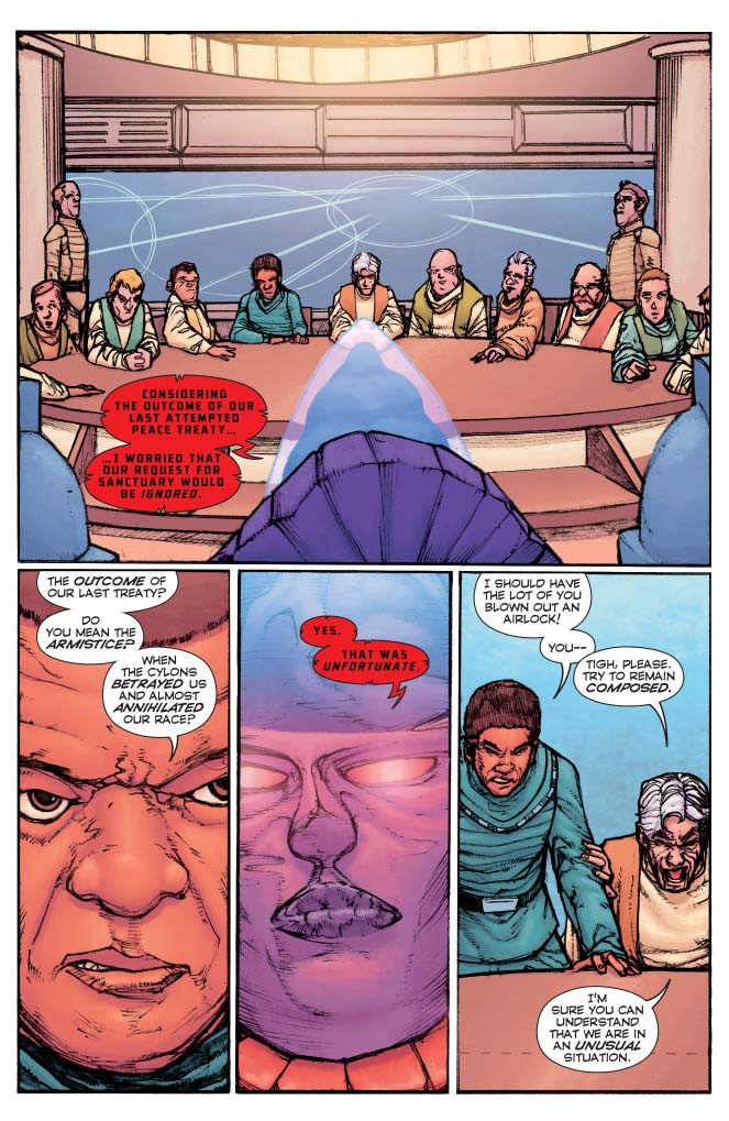 The Galactica has embarked on what might be its strangest adventure. Bizarre alien cultures. Old enemies–thought long lost–rising once more from the shadows. New, terrifying threats nipping at their heels. But perhaps the most surprising encounter is yet to come–as the Cylons approach the Colonial Fleet once more with an offer of peace.