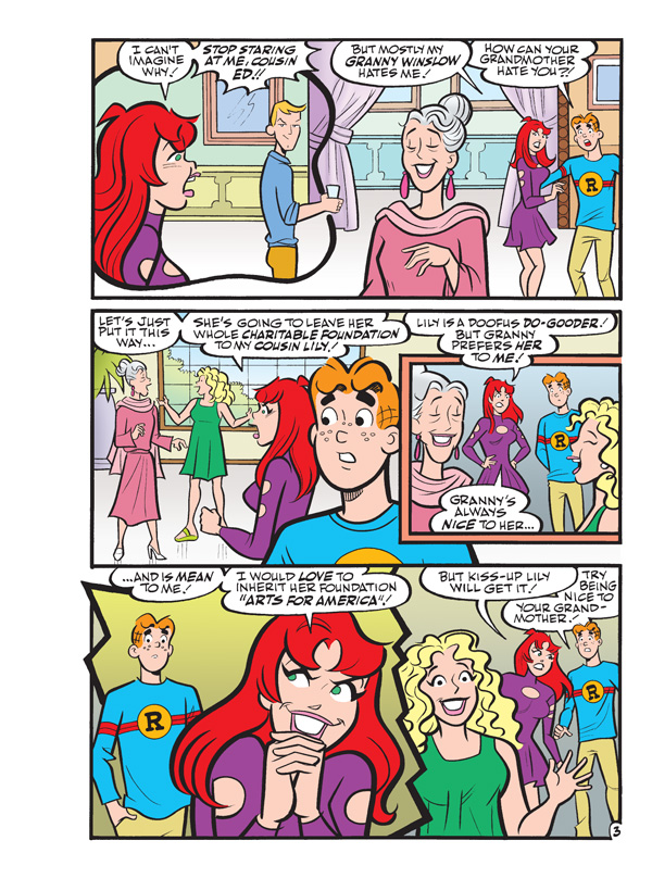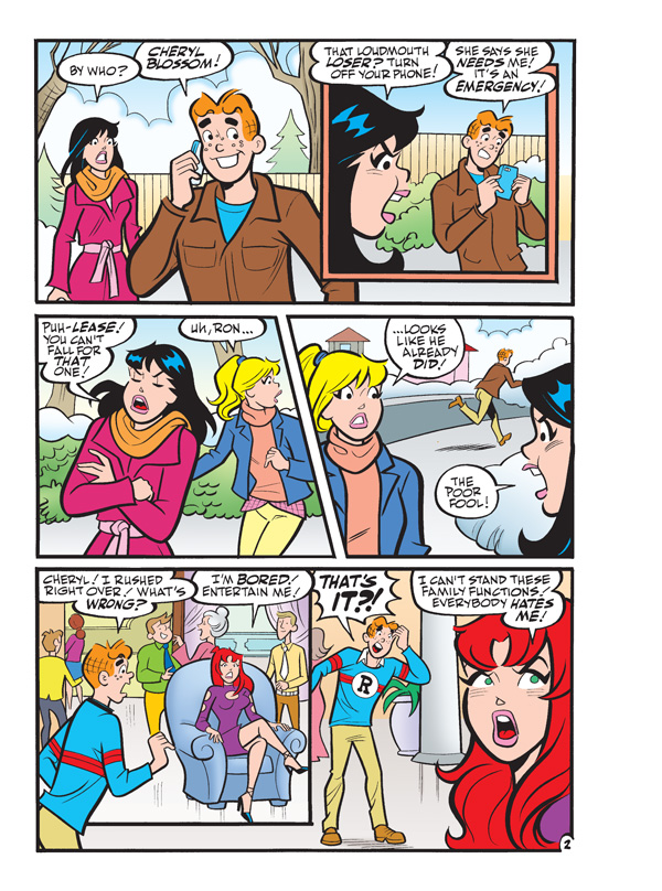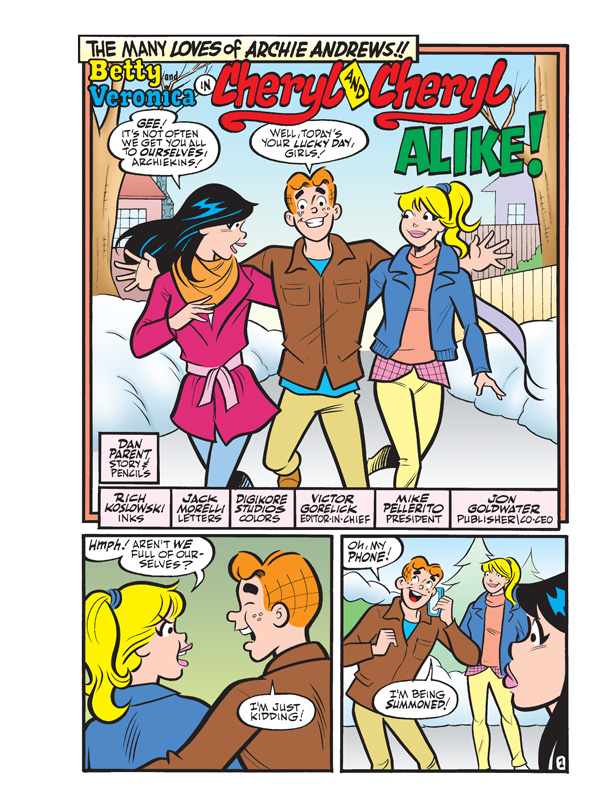 “The Many Loves of Archie Andrews” rolls on! This time, Betty and Veronica are excited to finally get some time alone (well, sort of) with Archie. That is, until, the firestorm that is Cheryl Blossom interferes! Cheryl has an emergency: she needs help being nice—or at least pretending to be nice in order to take over her grandmother’s charity foundation. Can Archie help Cheryl make a good impression? Or will Cheryl’s true personality get in the way? Find out in “Cheryl and Cheryl Alike,” the hilarious lead story to this comics annual, featuring even more pages of fun!