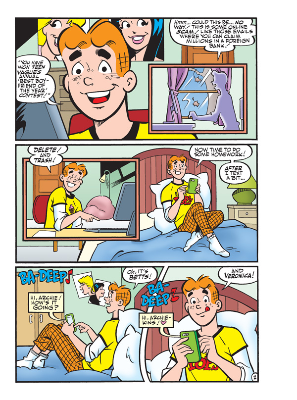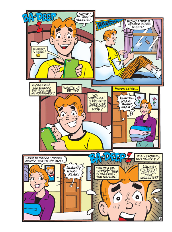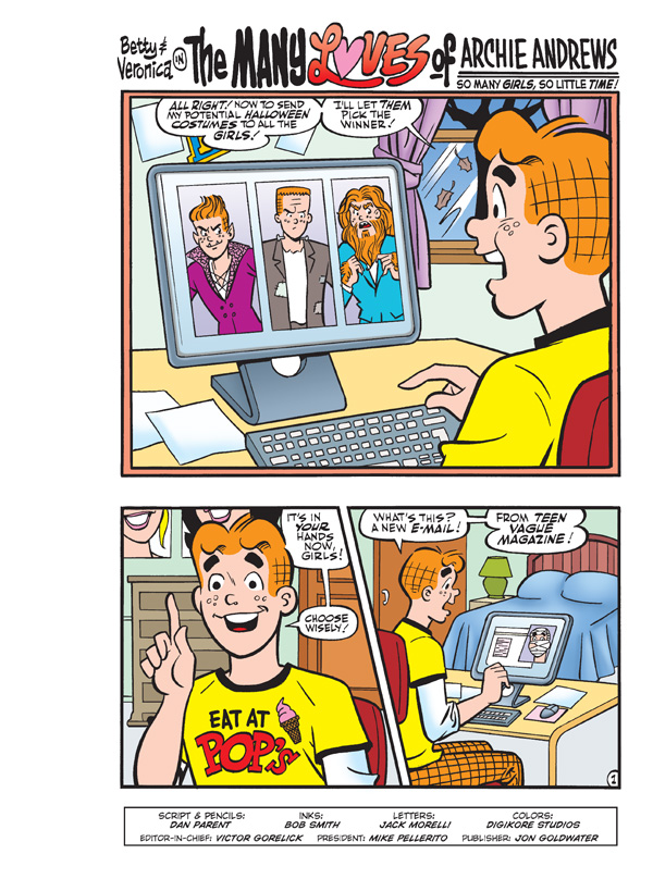 Archie has received notice that he’s been entered in a “Best Boyfriend of the Year” contest. This may seem like a great thing for Riverdale’s resident Romeo, but there’s one problem: he’s been entered by eight different girls—including Betty and Veronica! And here’s the real kicker—every girl is aware of every other girl’s involvement in this contest! Meet each one of Archie’s dates one by one in the part one of this 10-part series, “The Many Loves of Archie Andrews”! And that’s only the beginning of a fun-filled comics double digest!