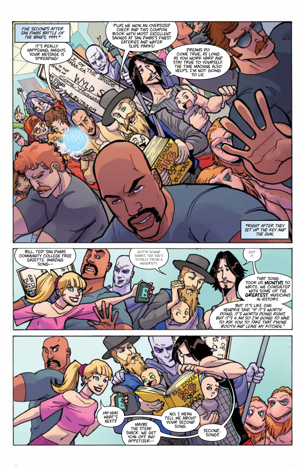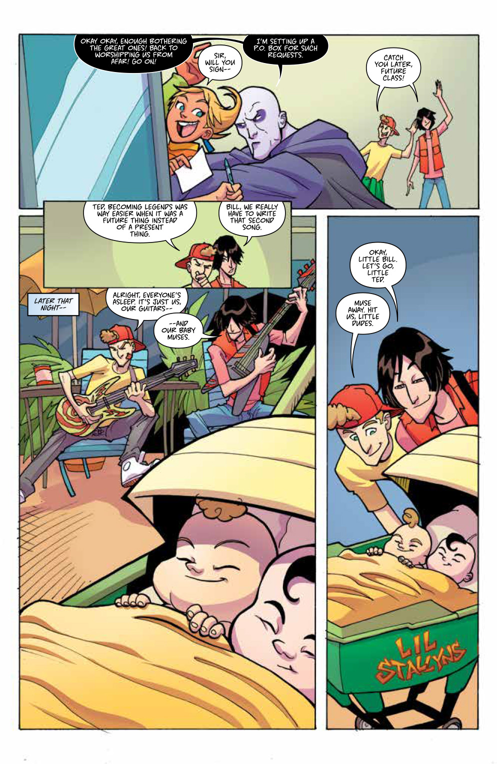What It Is: After winning the Battle of the Bands, Bill & Ted’s destiny is now in full swing. As the world waits for the Wyld Stallyns to unite the world with their music, Bill & Ted have to figure out how to live up to such expectations. They’ve only written one song! Going on an adventure spanning all time and worlds, Bill & Ted will have to find their muse in a young Chuck De Nomolos—Wyld Stallyns’ biggest critic, and the very same villain who grows up and kills them in his future. Can they “Rufus” this young villain, or is fate truly set in stone? Collects the complete four-issue mini-series and features an Introduction written by Alex Winter, who played Bill in the films!