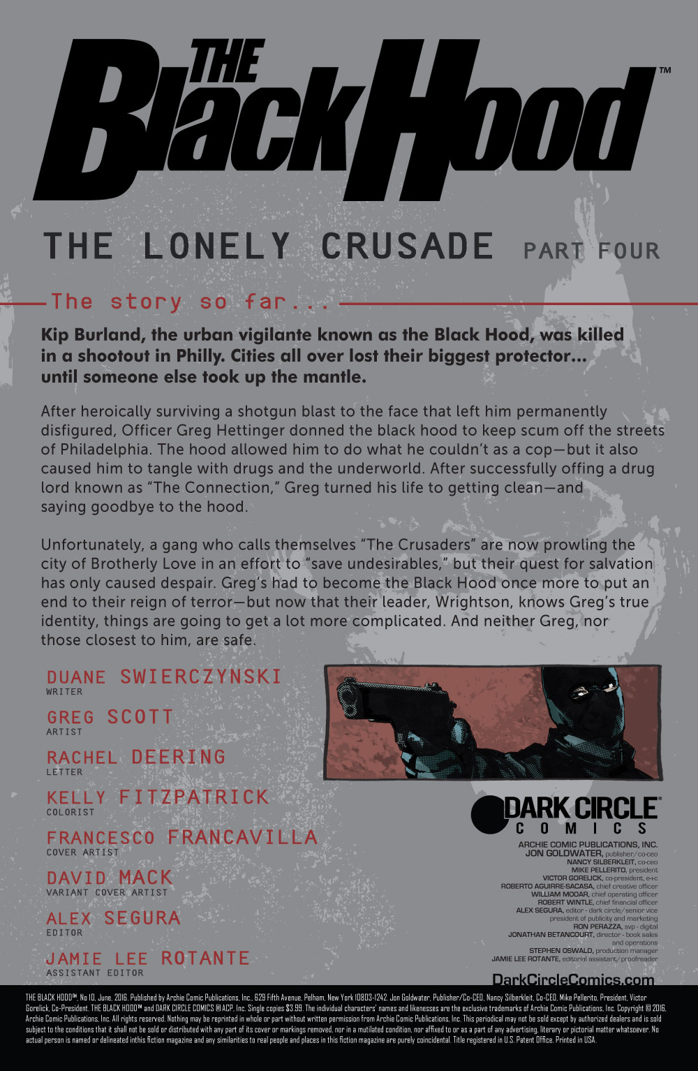 “The Lonely Crusade, Part 4” When he donned the Black Hood, Greg Hettinger swore to keep the awful truth from those he cares about most—his partner Devon, his friend Jessie. But he’s going to have to break those promises if he’s going to survive the death trap that the Crusaders have prepared for him… and nothing will ever be the same. Rated T+