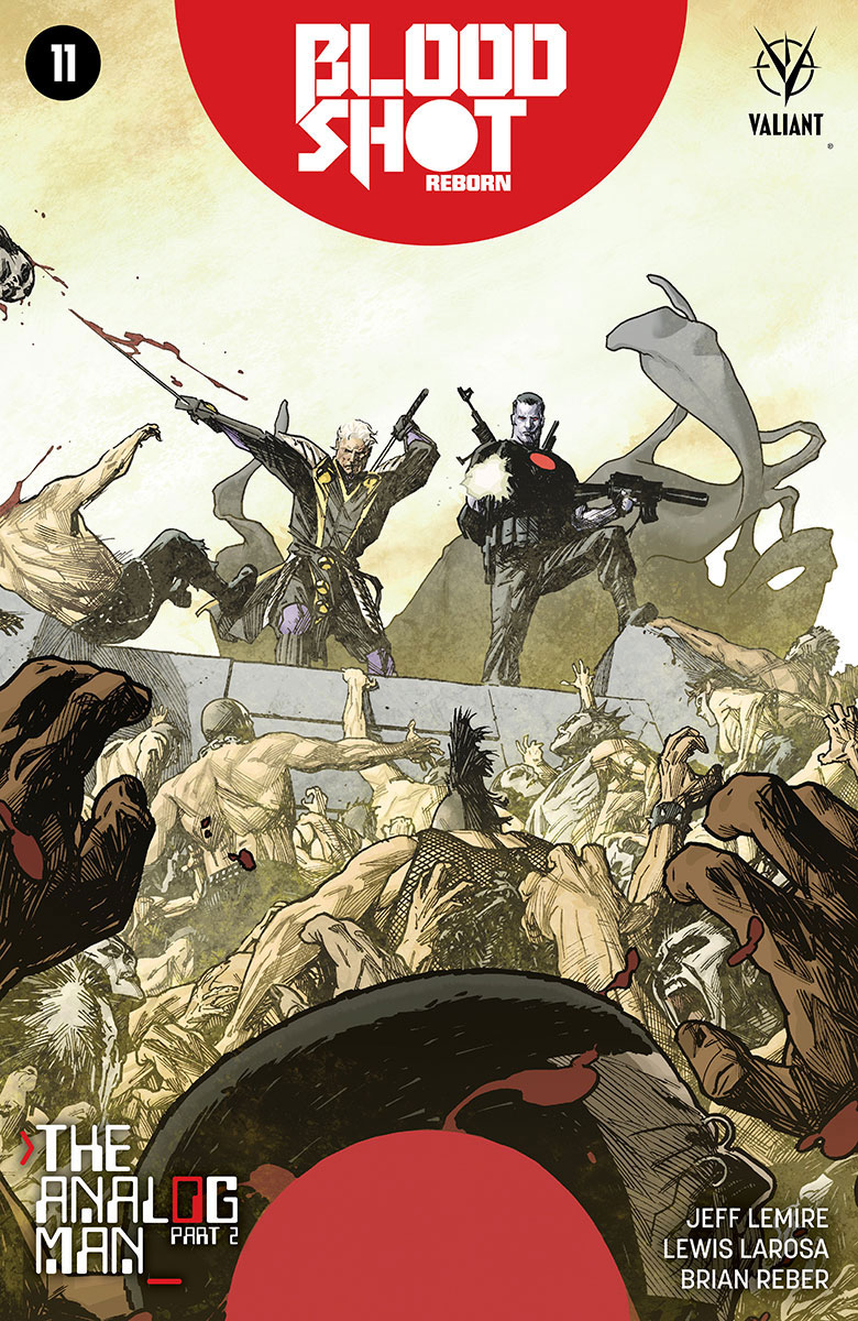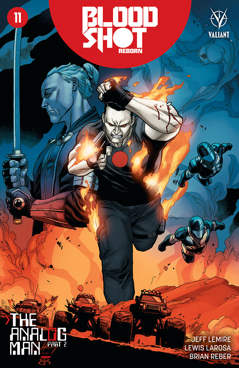 Valiant is proud to present your first fully lettered look inside BLOODSHOT REBORN #11 – the second earth-scorching chapter of “THE ANALOG MAN” from New York Times best-selling writer Jeff Lemire(Extraordinary X-Men) and blockbuster artist Lewis LaRosa (Punisher)! Presented in the deluxe, ad-free VALIANT PRESTIGE format with laminate card-stock covers, heavyweight end sheets, and exclusive backmatter, the biggest storyline of 2016 doubles down this February as Bloodshot charges through the remnants of the world that was for a double-barreled, widescreen action epic that must be seen to be believed!