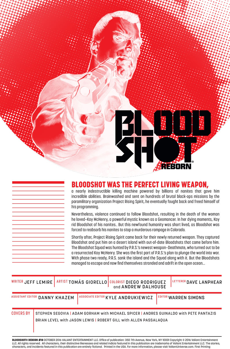 With “BLOODSHOT USA” on the horizon, it’s time to sink or swim as New York Times best-selling writer Jeff Lemire (Moon Knight) and rising star Tomas Giorello (Batman & Robin) toss Valiant’s band of nanite-fueled soldiers into the deep end!