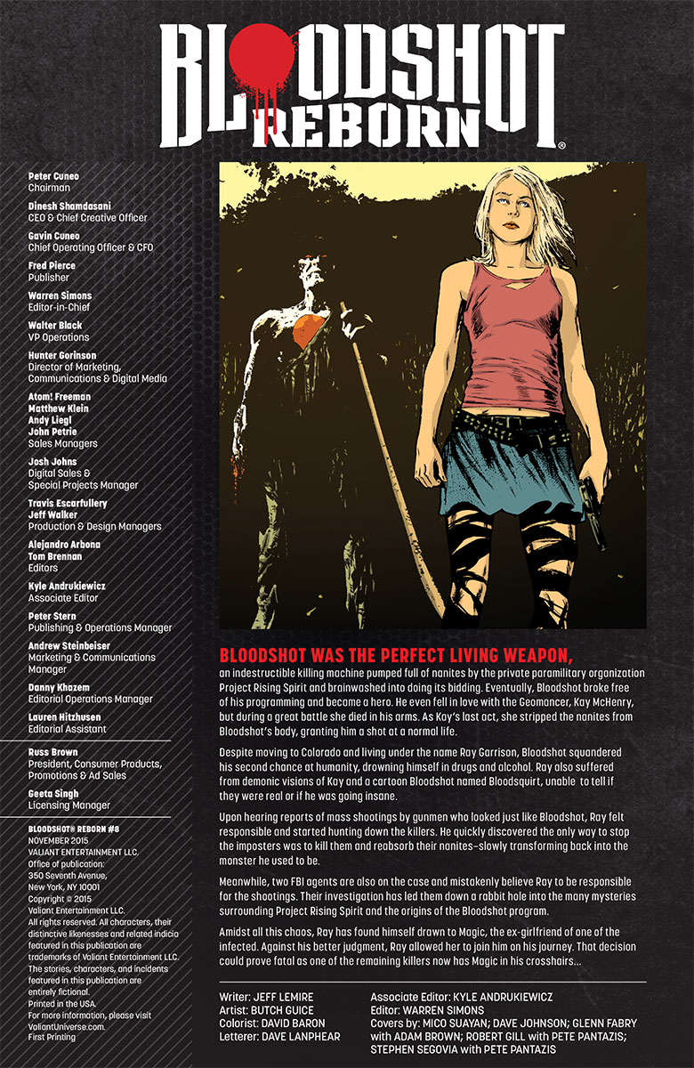 “THE HUNT” continues here as New York Times best-selling writer Jeff Lemire (Extraordinary X-Men,Descender) and legendary artist Butch Guice (Captain America) bring Bloodshot to the precipice of a devastating new revelation!