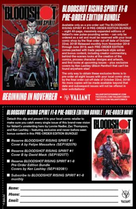 On November 14th, celebrated writer Kevin Grevioux (New Warriors) teams up with the incomparable writing duo of Lonnie Nadler and Zac Thompson (The Dregs) and comics legend Ken Lashley (X-Men) for an unforgettable journey into the mind of Valiant’s most unrelenting hero in BLOODSHOT RISING SPIRIT #1 – featuring covers by Felipe Massafera (Green Lantern: Emerald Warriors), David Mack (Kabuki), and Staz Johnson (Robin)!