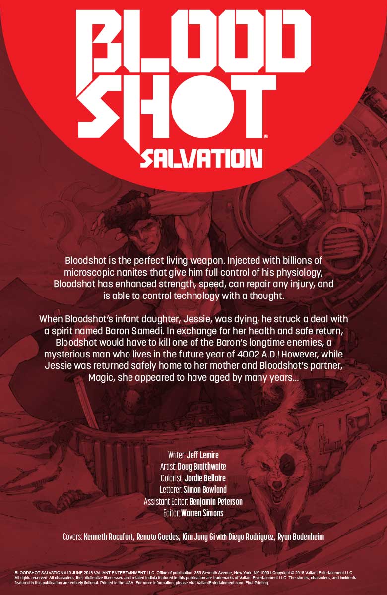 Two thousand years in the future – in the year 4001 A.D. – the man once known as Ray Garrison is no more…but the microscopic nanites inside him live on. Enter Bloodshot 4001 – a strange, gunslinging echo of Bloodshot’s mind, body, and soul that is now more machine than man. But when our century’s Bloodshot finds himself delivered to the dawn of the 41st century with one last mission to fulfill, two Valiant legends will finally come face to face…just as the secret revelation that binds them together across the ages will forever reshape Bloodshot’s place at the center of the Valiant Universe!