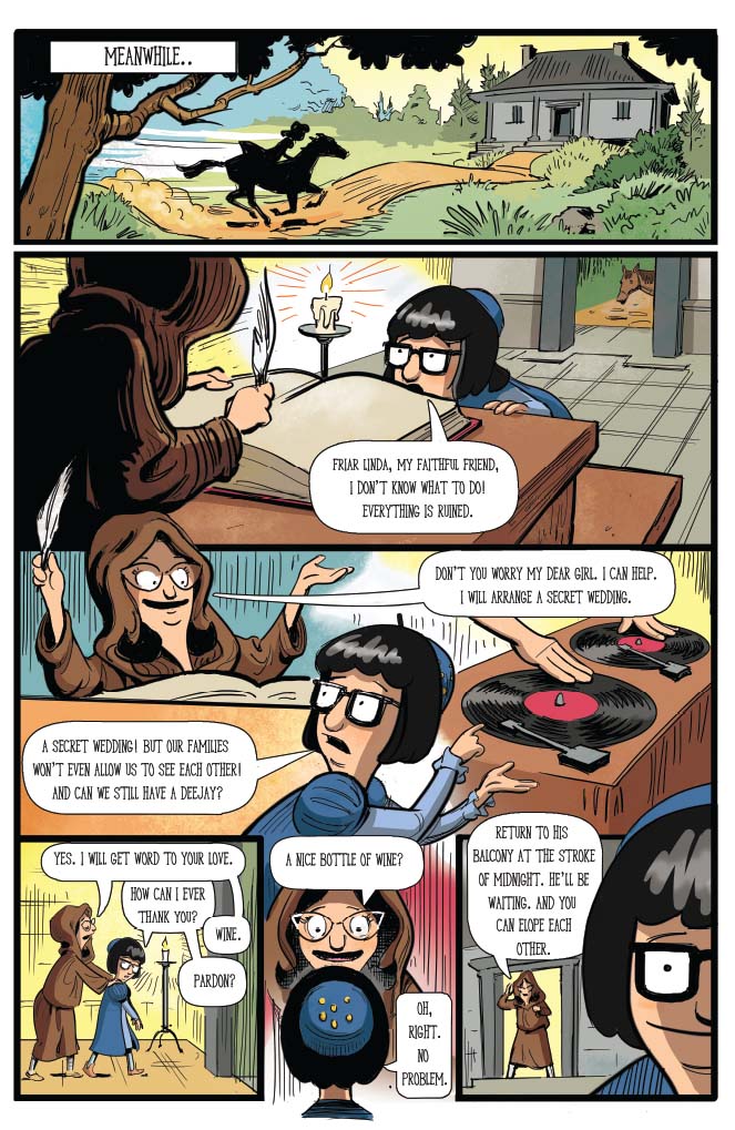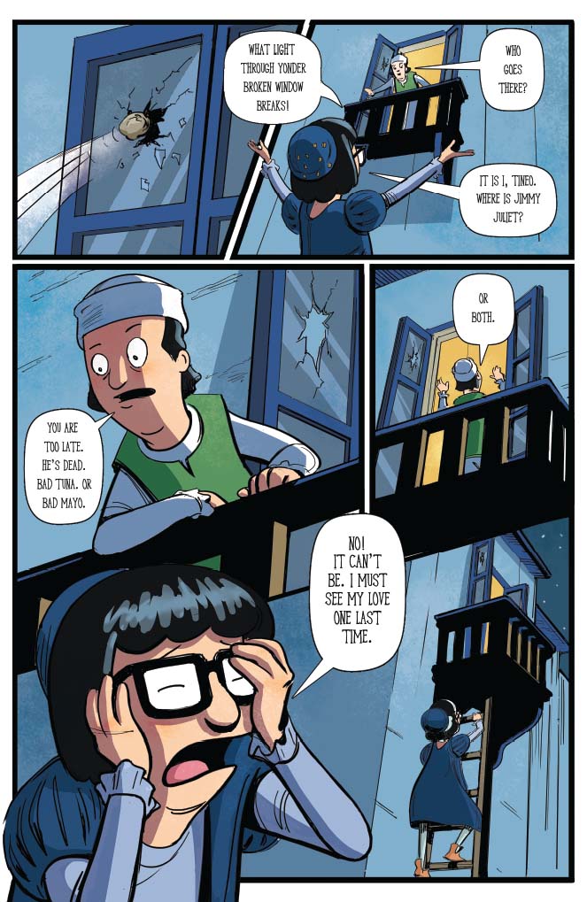 Issue #8 of the Bob’s Burgers Ongoing Comic Book offers readers a heaping plate of freshly cooked stories! Louise is on a new mission, this time teaming up with Regular Sized Rudy; Gene’s battle with Captain Hook-Beard continues in Peter Pants, Part 2; and the curtains close on Tina’s tale of Jimmy Juliet and Tineo. Everyone loves Bob’s Burgers, the fan-favorite animated sitcom that airs on Fox television with other hits such as The Simpsons and Family Guy!
