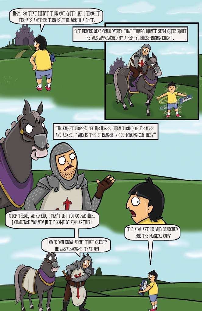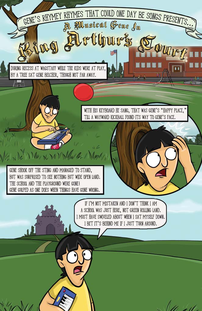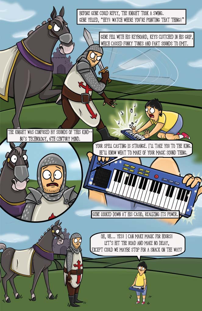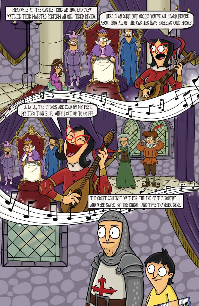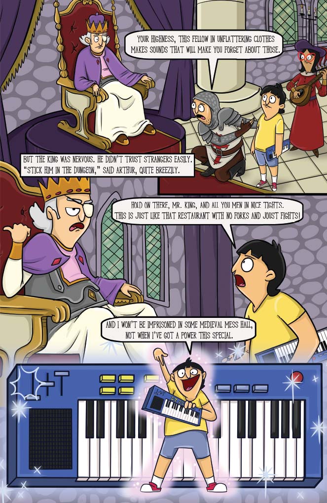 Gene serves up a magnificent medieval tale in Issue 15 of the Bob’s Burgers Comic Book! A rogue dodgeball sends Gene back in time – to a land of kings, and knights, and a wizard who’s just “meh.” Gene discovers that his modern-day Casio keyboard is really quite “magical” in the 6th century, much to Merlin’s chagrin.