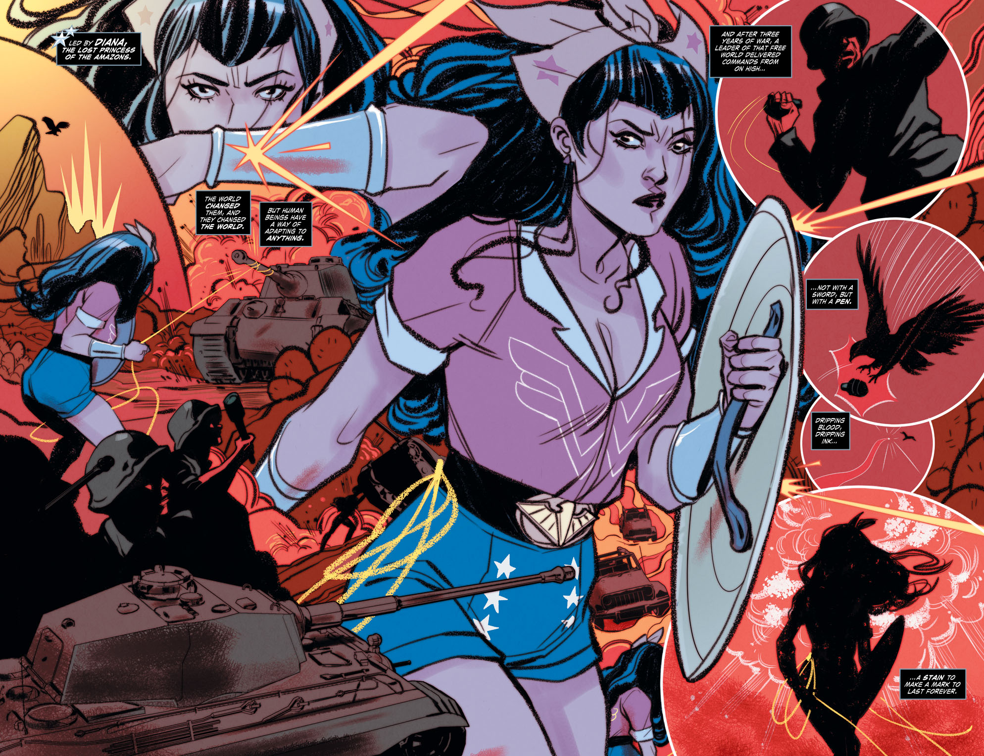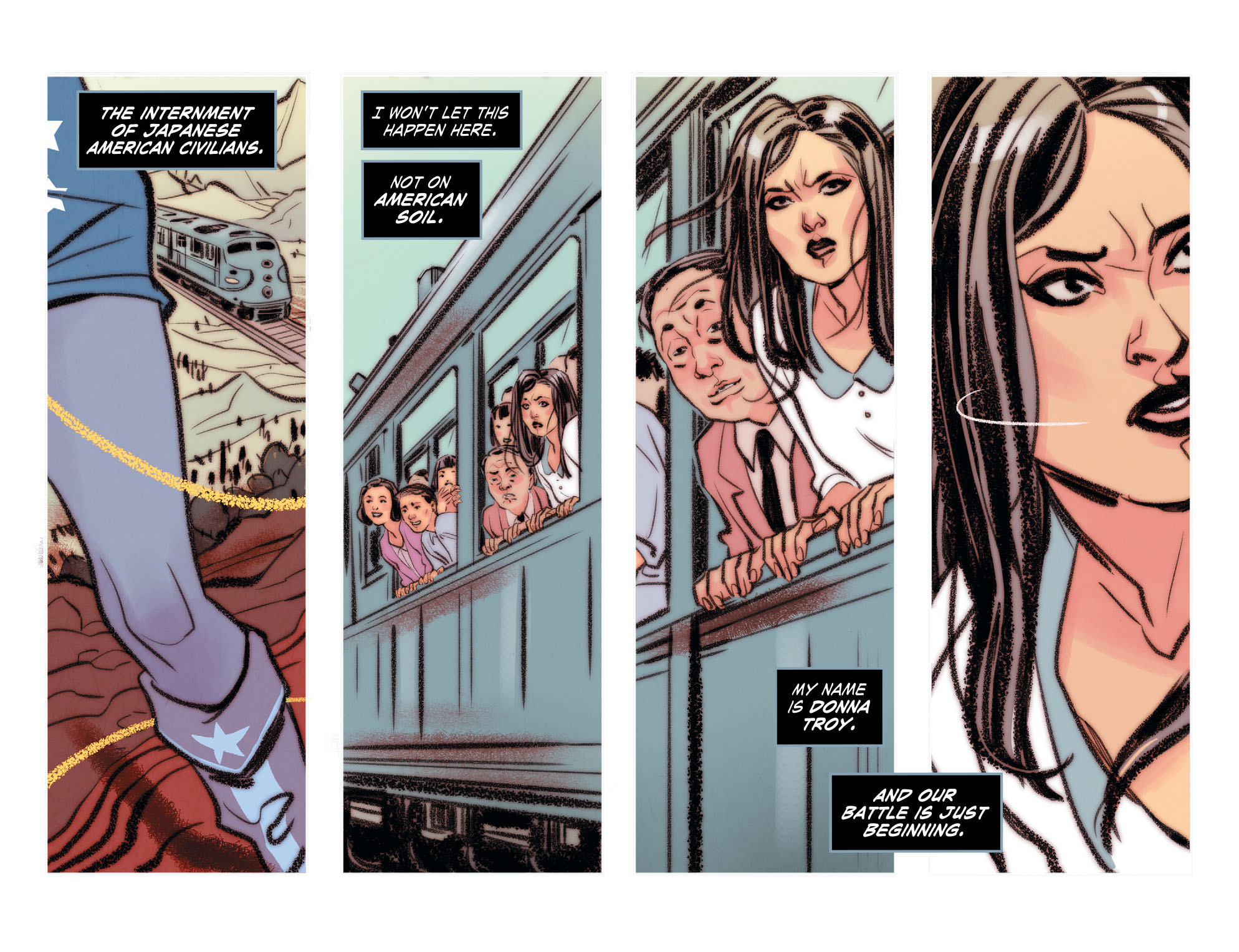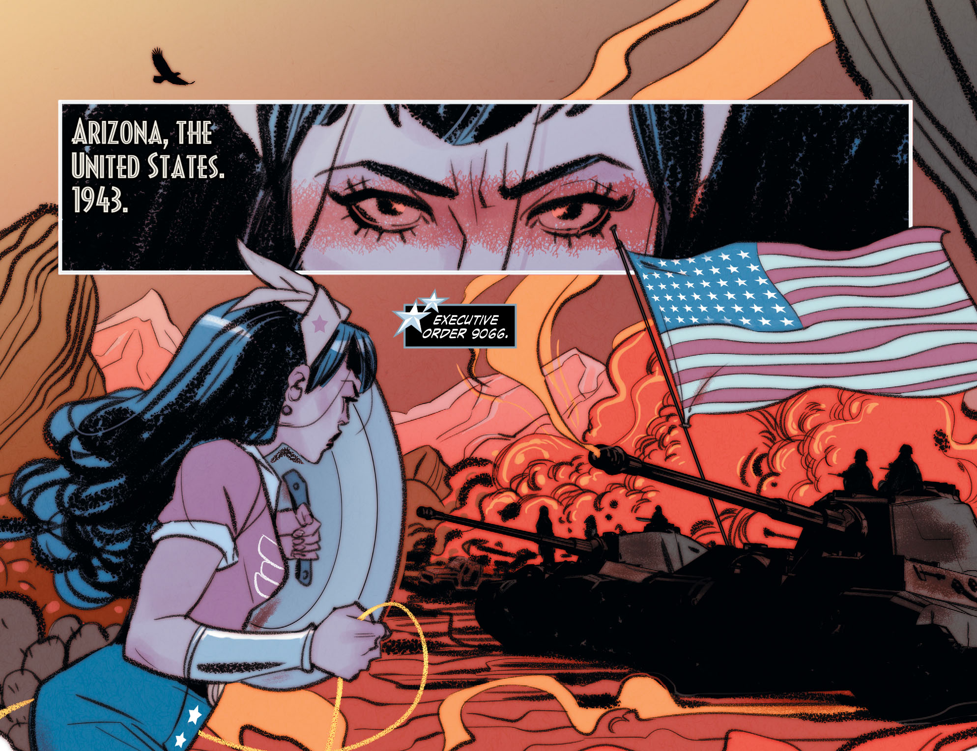 The Bombshells are back in an all-new series! As our new tale begins, the year is 1943, and Wonder Woman is called to Arizona for help by two young girls named Cassie Sandsmark and Donna Troy! The girls’ friends and families are being displaced from their homes and forced into internment camps! To save them, can Wonder Woman fight against the same people she once fought alongside?