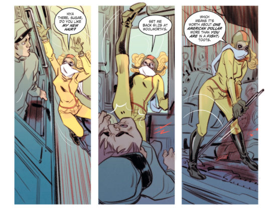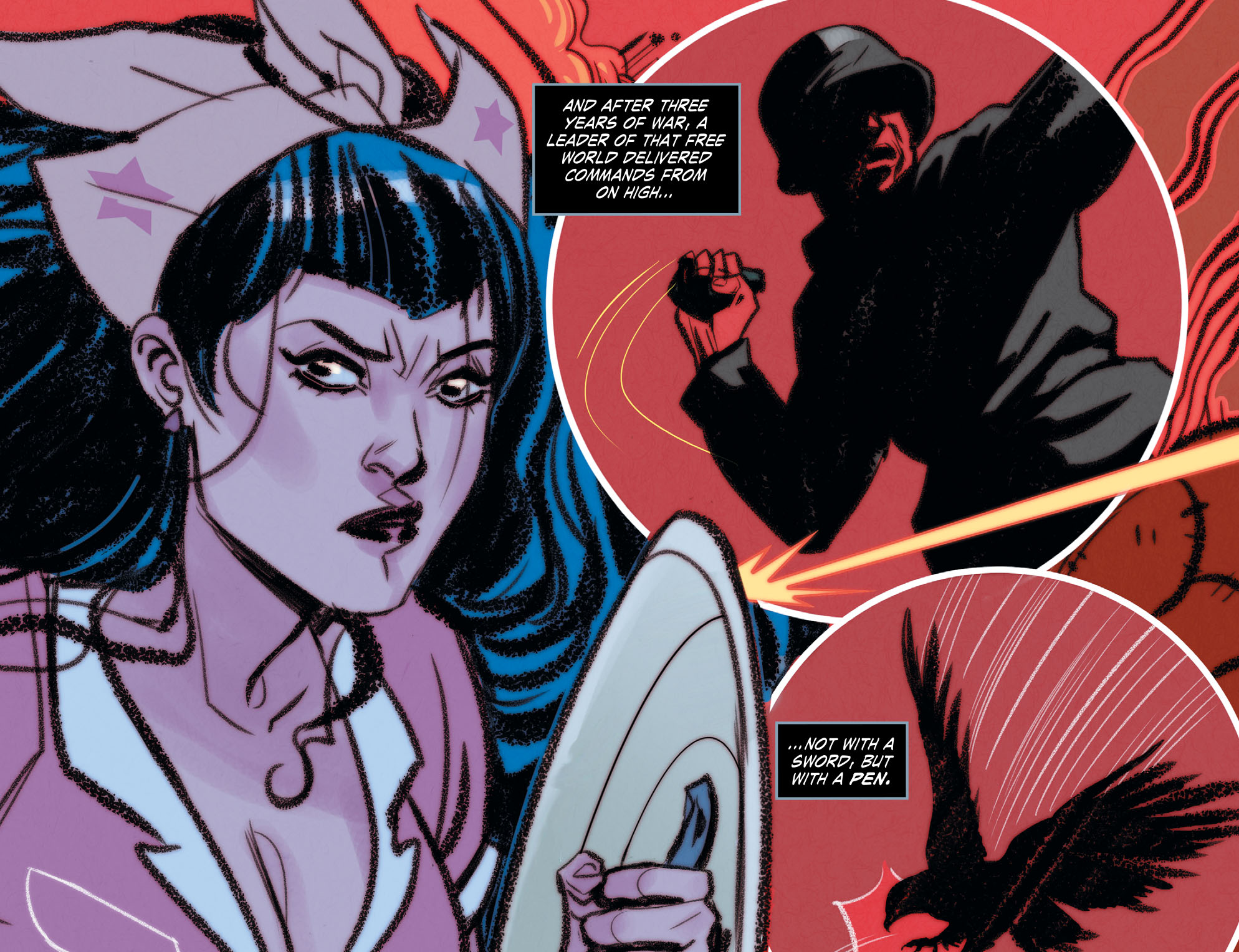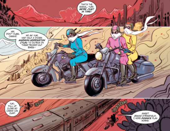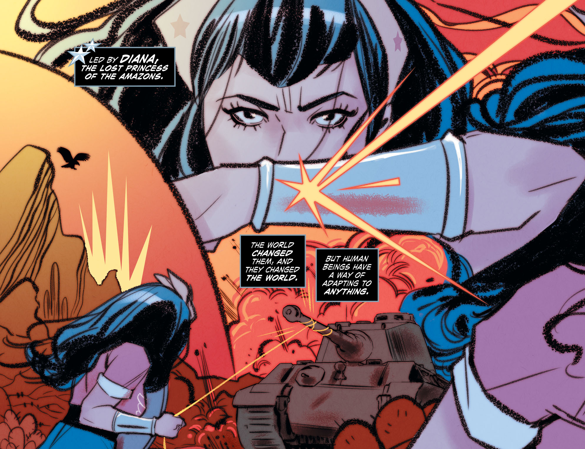 The Bombshells are back in an all-new series! As our new tale begins, the year is 1943, and Wonder Woman is called to Arizona for help by two young girls named Cassie Sandsmark and Donna Troy! The girls’ friends and families are being displaced from their homes and forced into internment camps! To save them, can Wonder Woman fight against the same people she once fought alongside?