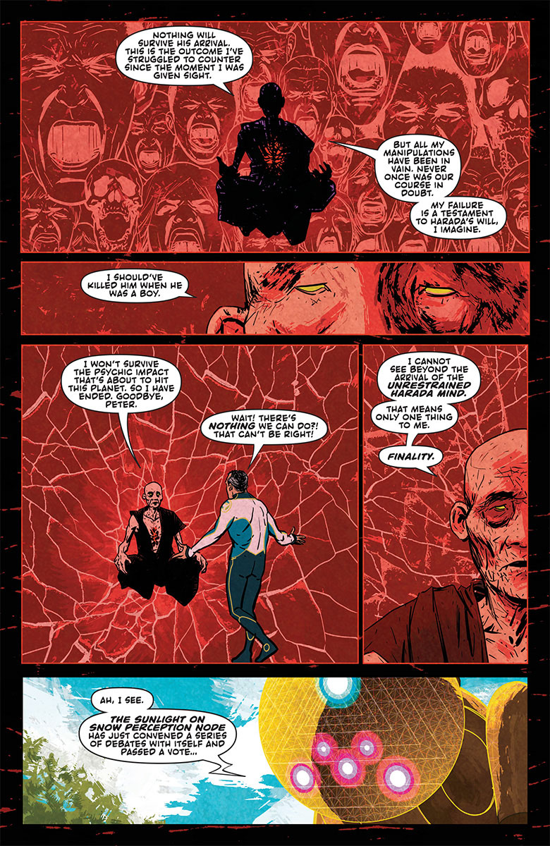 Many years from today, Peter Stanchek, the Renegades, the Harbinger Foundation, the Bleeding Monk, and Toyo Harada’s Imperium all reach their terminus, as the entire planet becomes the battlefield for the most devastating psionic combat humanity has ever seen. The Great Destroyer, long prophesied and foreseen, comes to Earth at last. Who will survive…and what will be left of them?