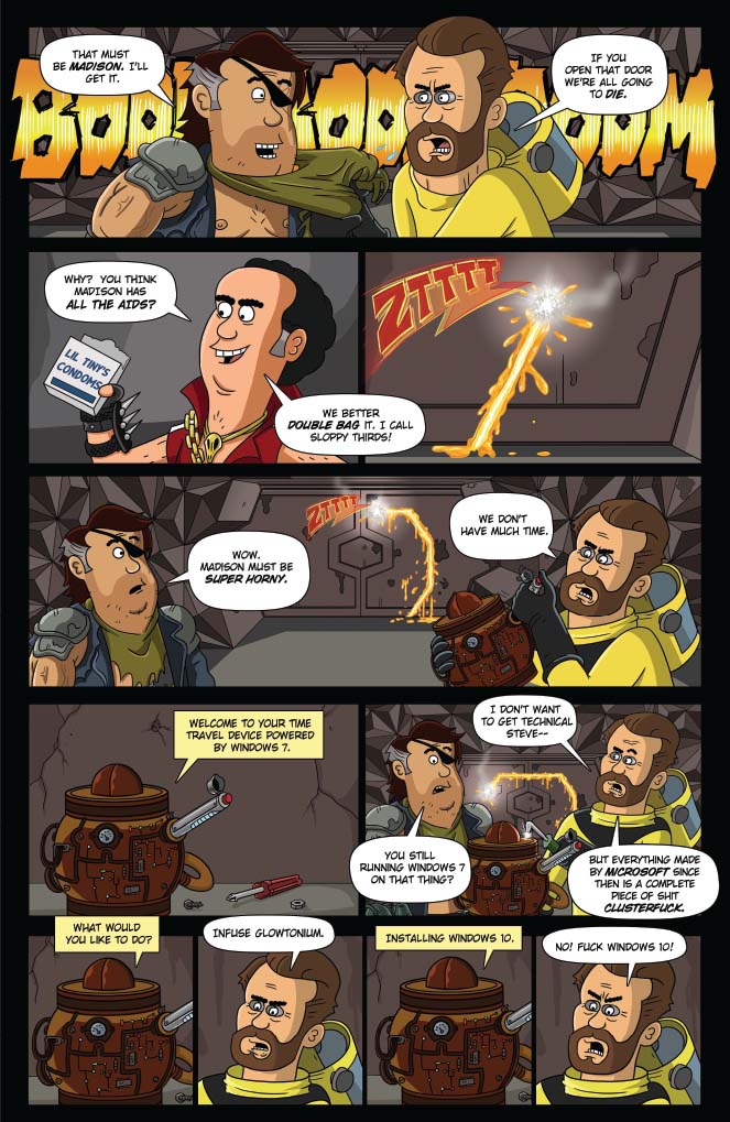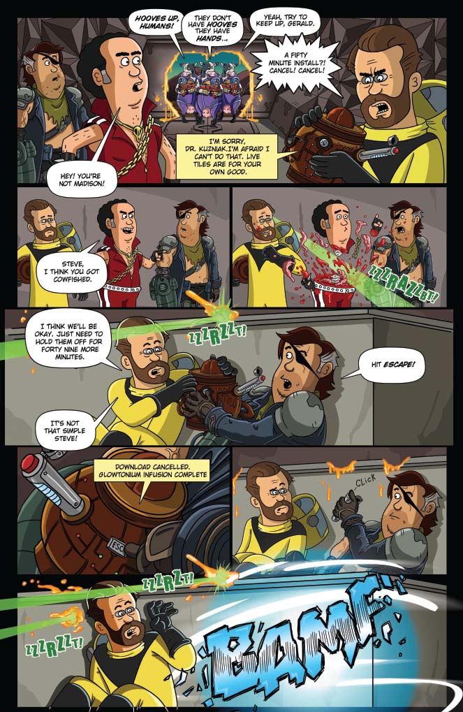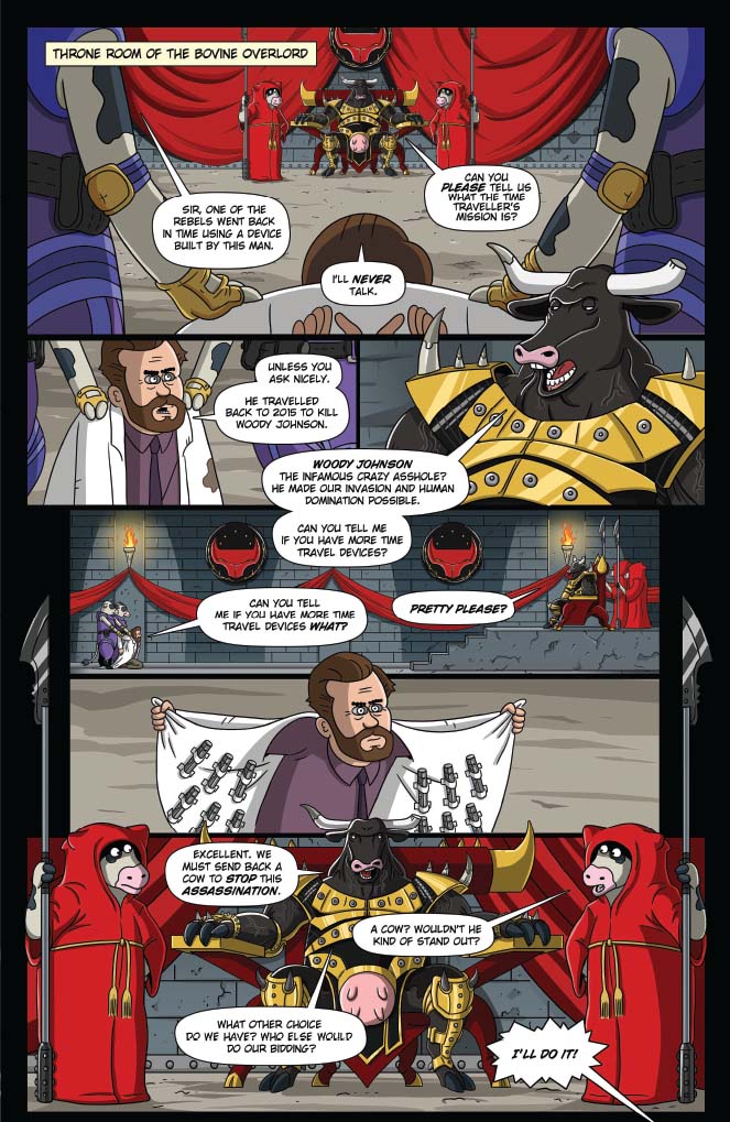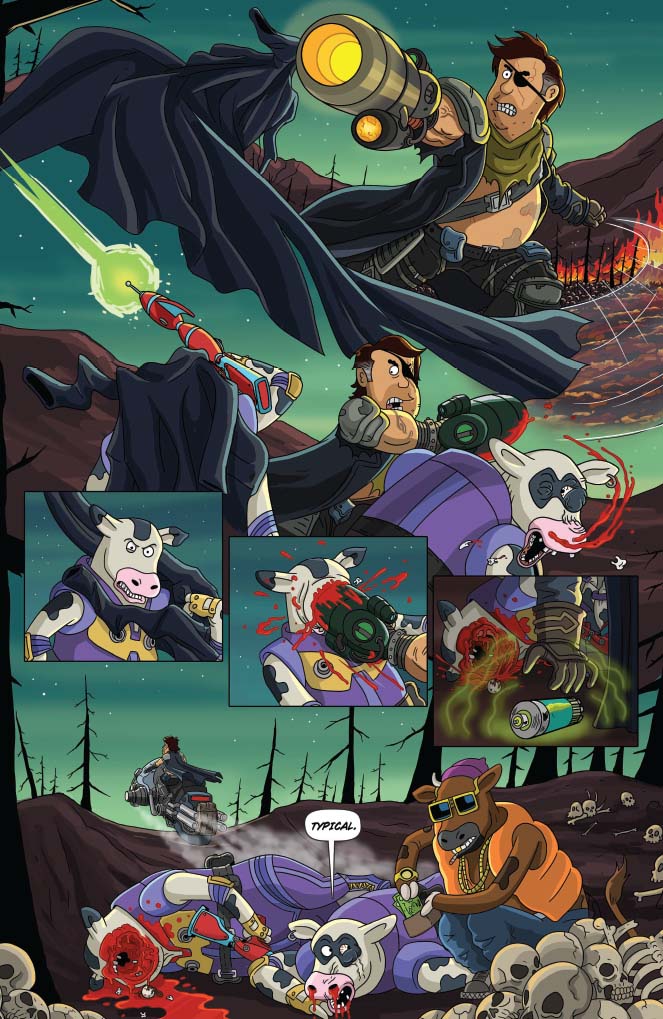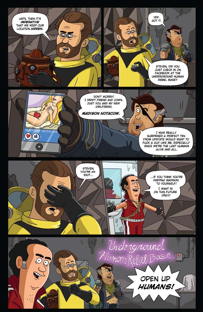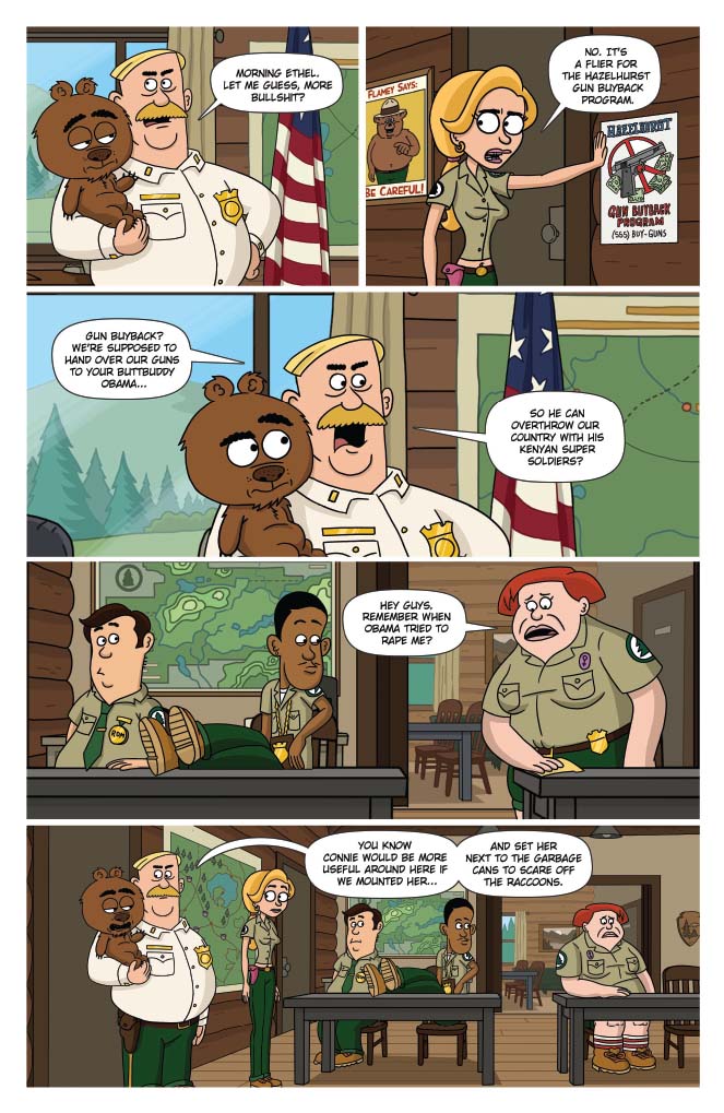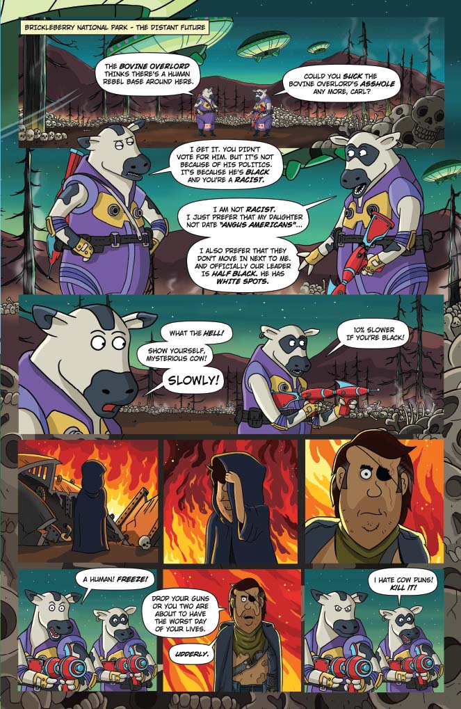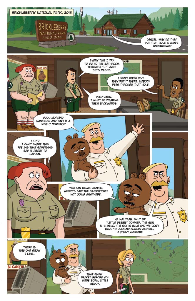 Brickleberry’s back, and now in comics! Written by show creators Waco O’Guin and Roger Black, the epic “ArMOOgeddon” storyline picks up right where television’s most outrageous animated sitcom left off!  In the distant future, Steve Williams — the only Brickleberry park ranger who managed to escape death at the hands of the Alien Cow Invasion — has joined forces with a small group of human rebels in an underground hidden base. With the help of Dr. Kuzniak, Future Steve must travel back in time to the year 2015 and kill head ranger Woody Johnson, whose actions led to the Invasion and the destruction of all humanity. But Denzel Jackson has other plans for Steve’s time travel technology, redneck Bobby Possumcods willingly submits to Alien Cow domination, and Connie’s advances toward Ethel get… weird.