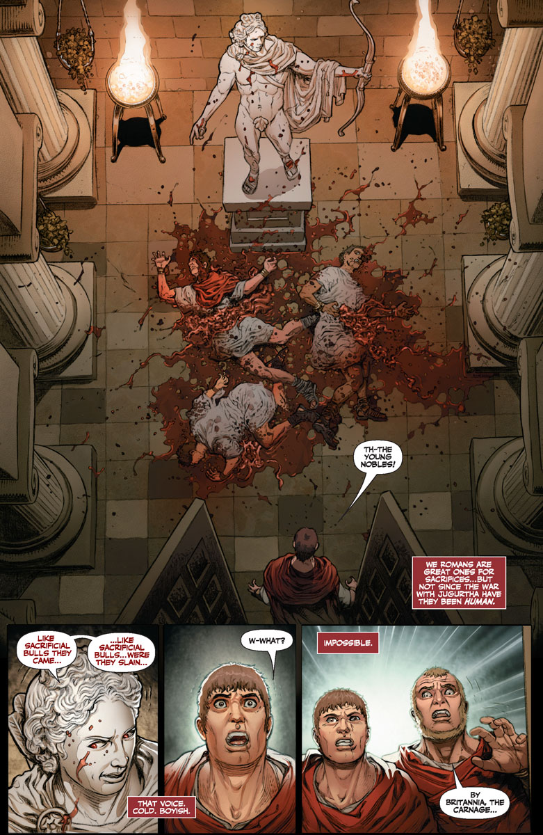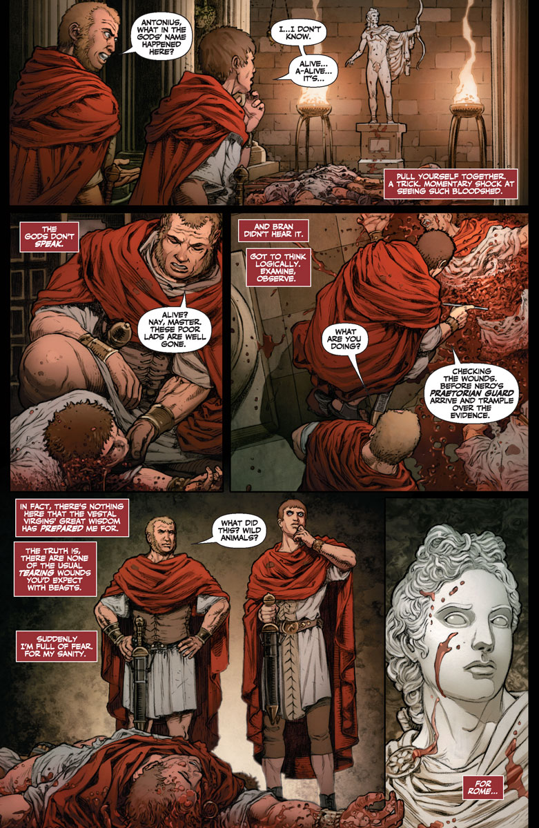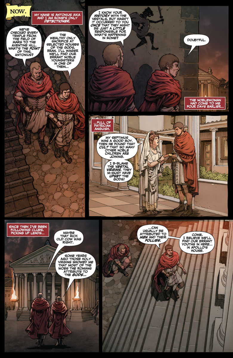 On the other side of Rome, a strange mystery swirls through the Palatine Hill. In the dead of night, down winding alleys, Rome’s elite swear that they see visions of a blood-soaked Apollo walking the city…visions that are driving them mad. Even more are becoming sick with weird fever god-dreams. Panic ensues in the city. The Chief Vestal, Rubria, is arrested by Emperor Nero and threatened with crucifixion unless the deadly curse that’s fallen on Rome is lifted. She asks Antonius Axia, hero of Britannia and Rome’s only detective, for help. She offers only one clue…the gladiator Achillia.