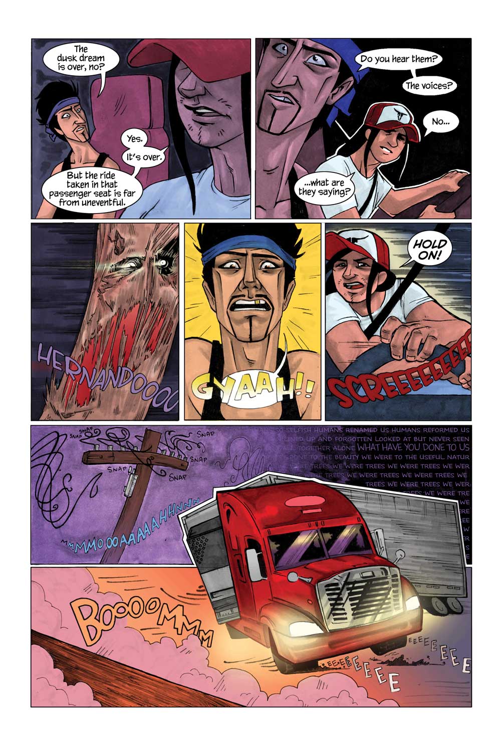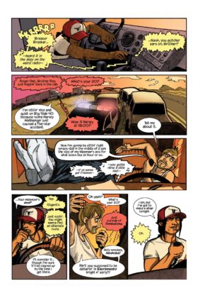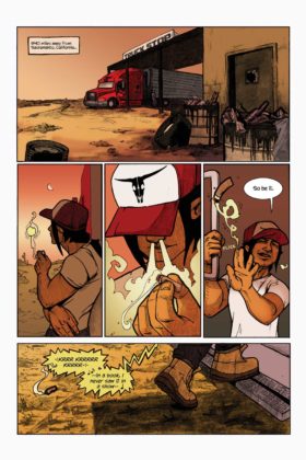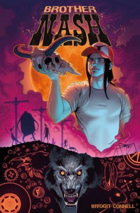 According to writer/artist Bridgit Connell, “Brother Nash is about a mysterious trucker out West who gets lost in a supernatural adventure with his two friends, a bumbling sweetheart and fellow trucker named Ray, and a strong-willed ranch owner named Billie. On the road they encounter tricksters, motorcycle gangs, zombies, creepy ghost kids, high-speed chases, giant monsters, redneck shaman, witches… and find out that the lore behind astronomy is alive and roaming the earth.”