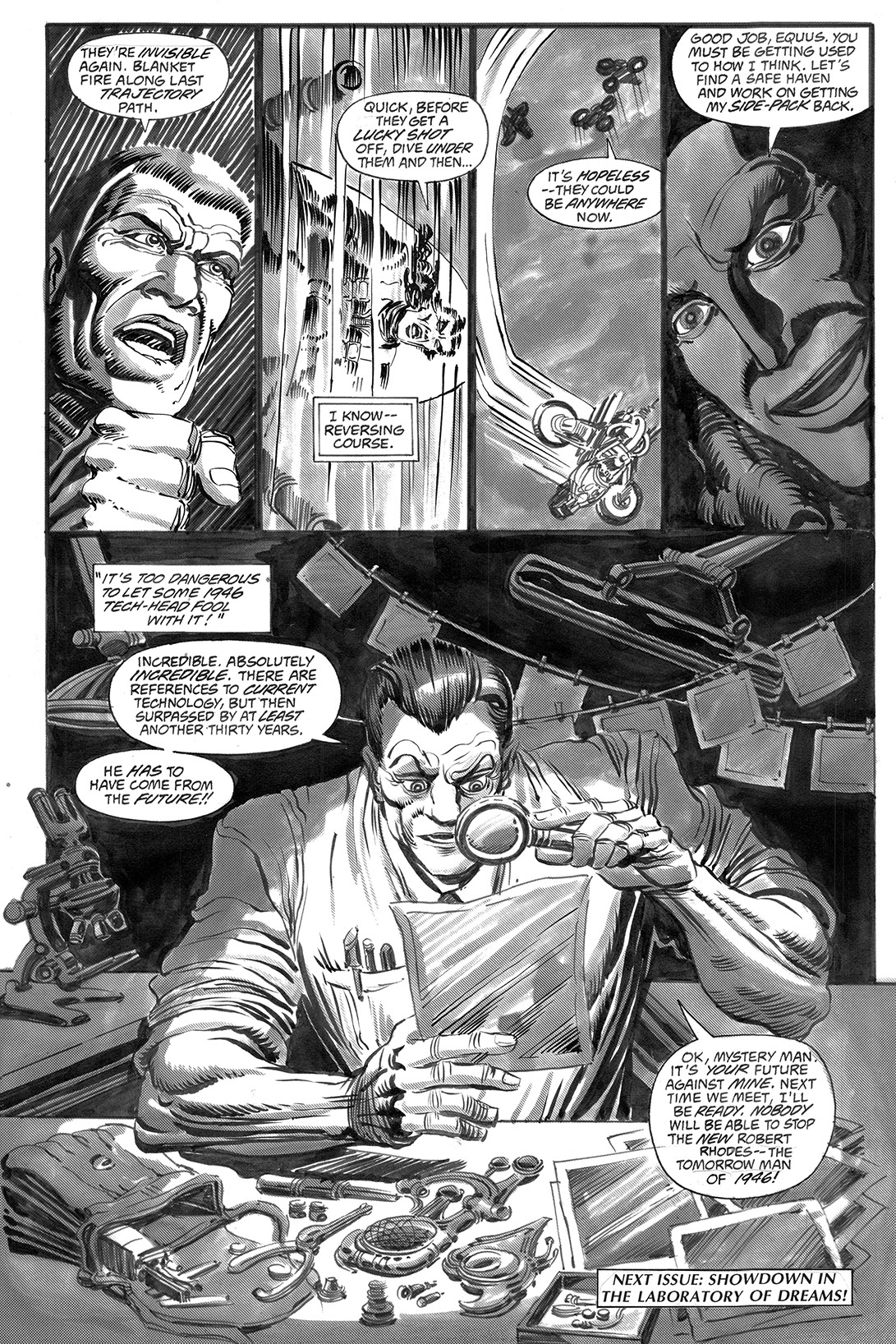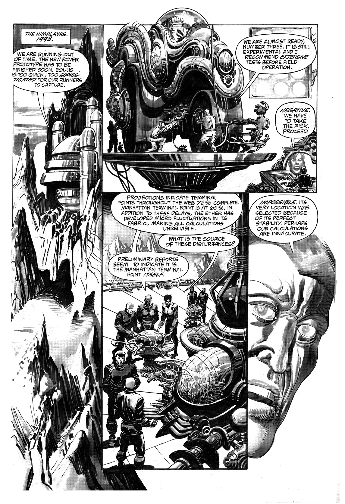 BZ: Terminal Point is a time travel love story. It takes the idea that there is a secret entity called The Terminus Agency who try to control time and space by building these beacons. Looking back now it’s funny because I called it the web in 1993 before it was associated with the World Wide Web as a terminology. I thought, “Oh this is a cool sounding name,” (laughs). So my matrix of time and space is called the web. The agency is building beacons throughout the dimensions and when all of the beacons become activated they connect into a matrix that can control time and space. Terminus employs web runners who use these three wheelers through the web and they are sort of like linesmen working for Western Union. They are out there in the wilderness of dimensions constructing these beacons. One that we focus on is named Pilot. He’s a new prototype of web runner that is tasked with carrying out the Agency’s final plan. He has other plans however. He ends up hiding out in 1946 New York and falls in love with this nightclub singer. So suddenly the story shifts into a film noire setting in Manhattan with nightclubs and men in wide shouldered suits and fedoras. Everything has this punky atomic age retro feel to it. I love film noir movies and just thought it would be a great setting for a science fiction tale where the future meets the past.