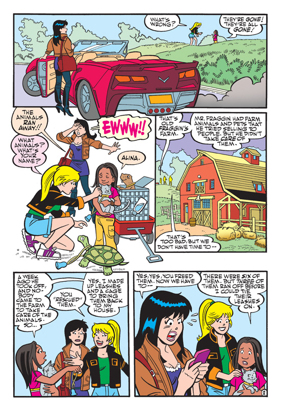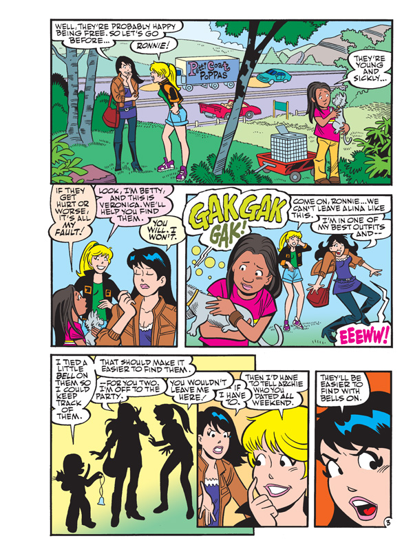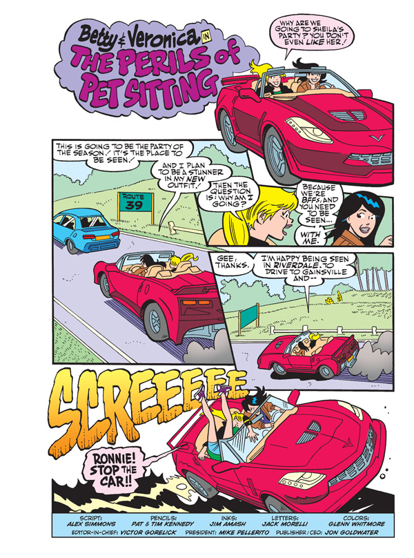 Betty and Veronica are on their way to a party held by Riverdale’s reigning fashion queen Sheila Wu—and Veronica’s determined to out-dress her at her own party! However, on their way to the gala, Betty encounters a young girl with some animal friends in need of assistance on the side of the road. The adventure begins as Betty, Veronica and their new acquaintance Alina try to wrangle up her stray pets. Will the pets be safely returned? Will Betty and Veronica make it to the party unscathed? Find out in “The Perils of Pet Sitting,” the exciting new lead story to this JUMBO-sized Comics Digest!