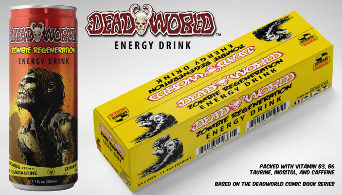 August 14, 2018. Caliber Comics is proud to announce the launch of its newest Deadworld comic tie-in product. The Deadworld Zombie Regeneration Energy Drink. This canned 11.1oz (330ml) energy drink comes packed with vitamin B3, vitamin B6 and caffeine and features eye-catching graphics on the label. The energy drink has a suggested retail price of $2.99. This product compliments Caliber’s existing line of glass bottled Deadworld Zombie Sodas (