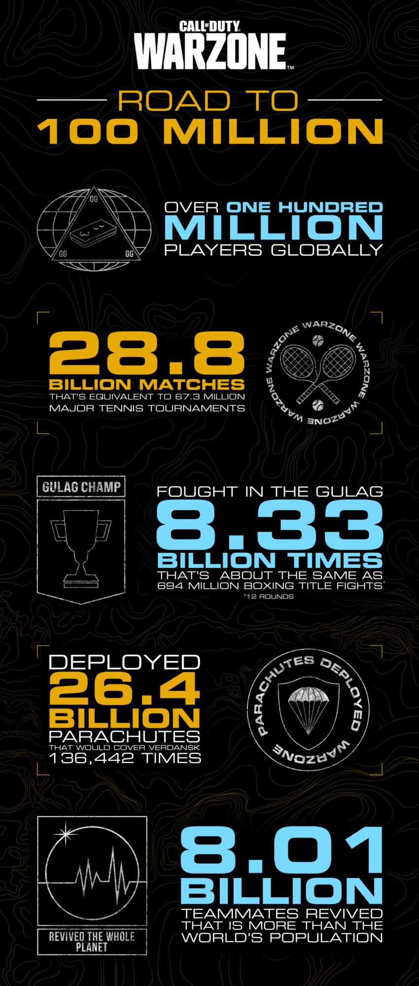 Along with reaching 100 million Warzone players, check out the following infographic to show our findings across 28 billion matches, with a global player base of Operators infiltrating Verdansk and Rebirth Island from all seven continents.