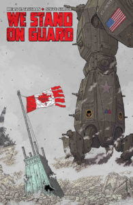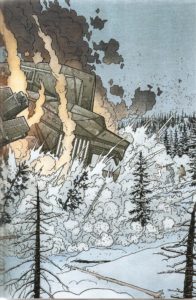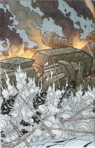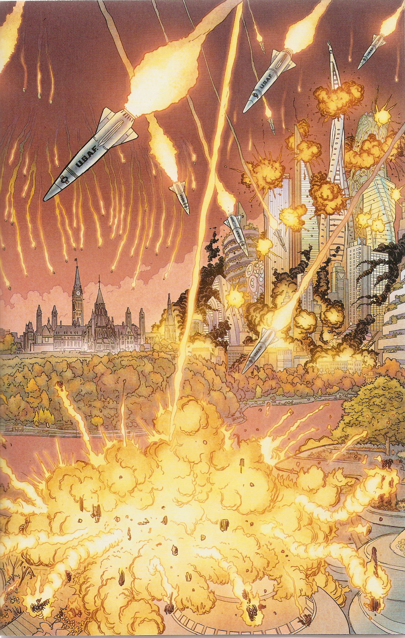 Steve Skroce is all over the map. He lovingly paints the vast Canadian landscape but then proceeds to destroy it!! His two-page spread of Ottawa has the futuristic with the traditional, most likely a nod to BKV’s missus. The other two-page spread detailing the Guerilla’s descent made my ears wince and my skin cringe at the disruption of the calm snowscape. The last page pronounces the carnage brought by the Guerilla. It is inconceivable that seven individuals bested this behemoth!