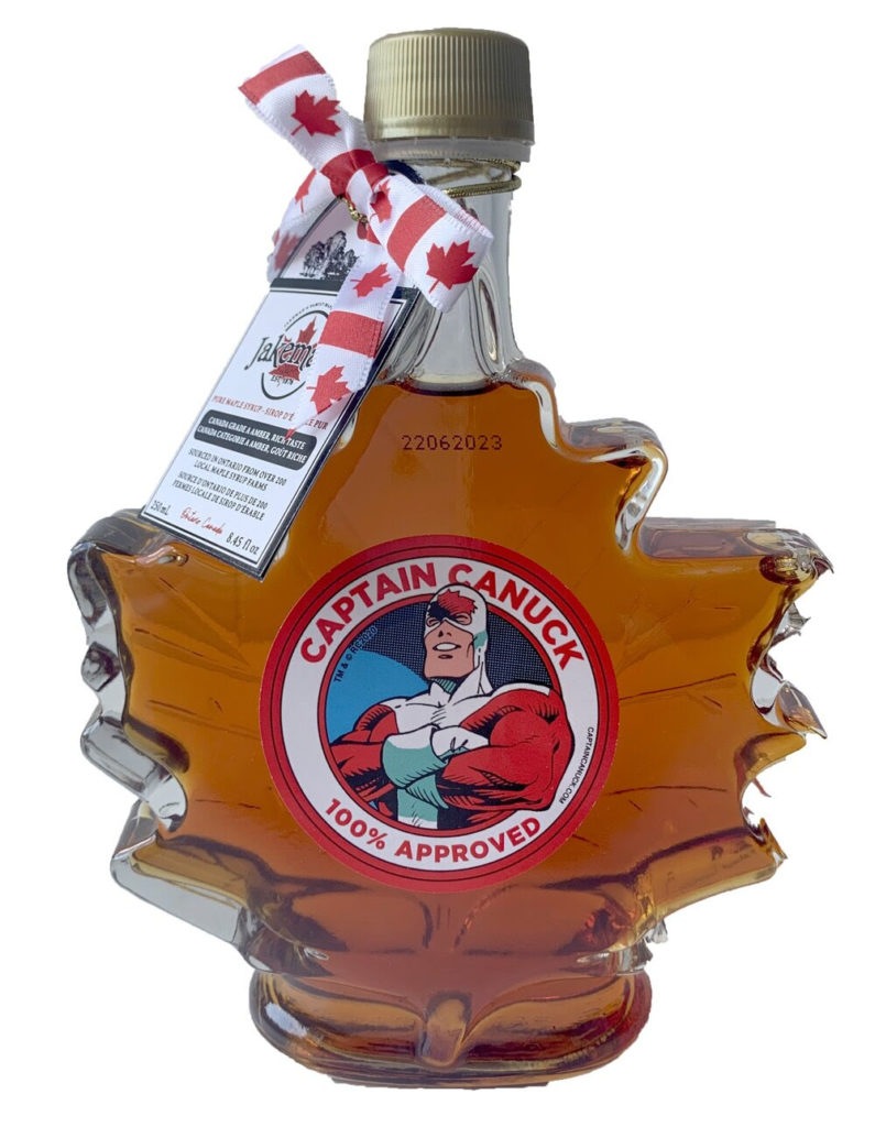 JAKEMAN’S X CAPTAIN CANUCK Canada Grade A Amber Pure Maple Syrup is now available in exquisite 250 ml Maple Leaf style bottles so you can get even more of the good stuff in you!
