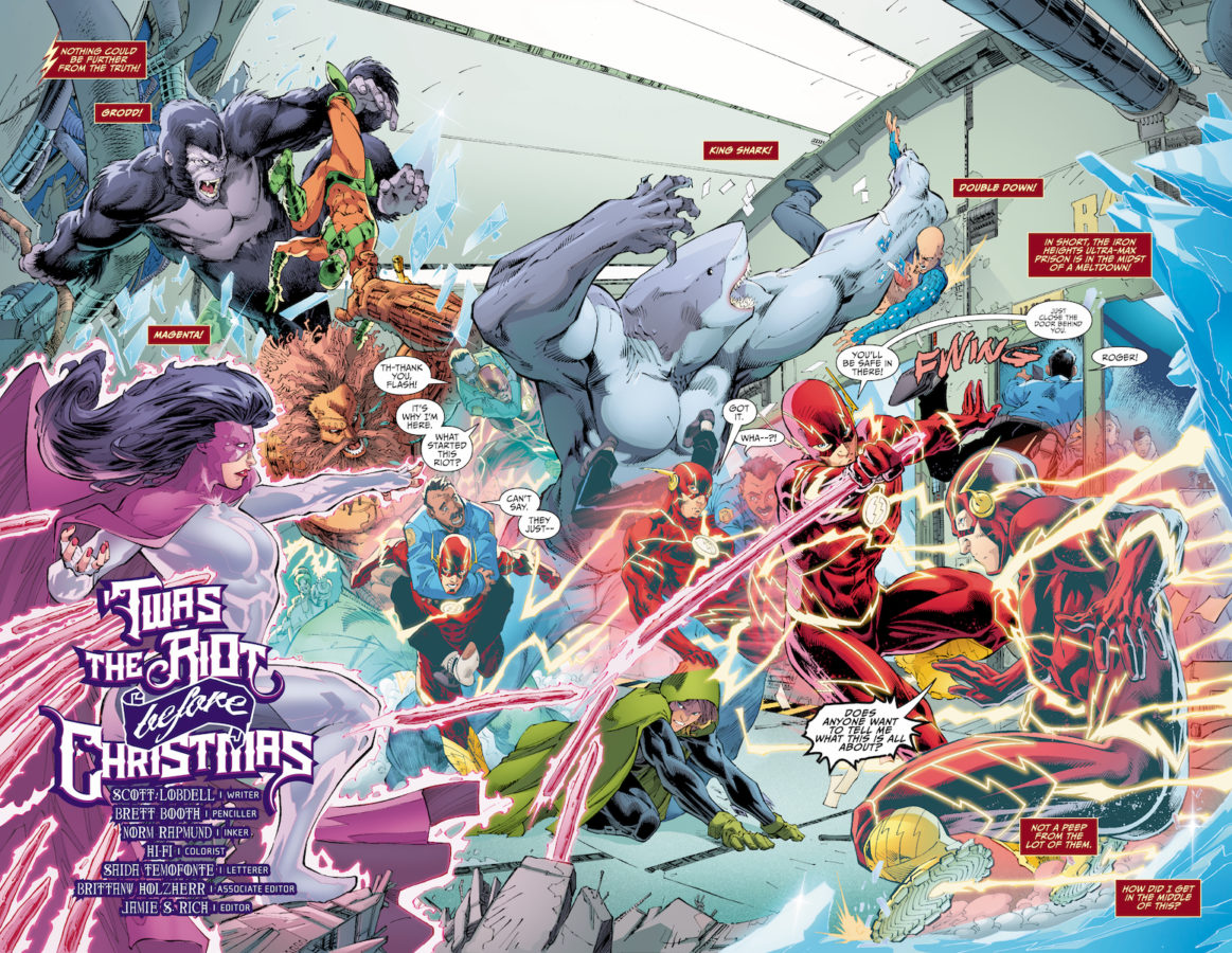 The fan-favorite creative trio of THE FLASH—Scott Lobdell (writer), Brett Booth (artist) and Norm Rapmund (inker)—have reunited for an original tale featuring the Scarlet Speedster, “Twas the Riot Before Christmas.” Barry Allen’s holiday tradition of giving gifts to the kids at the Central City Home for Wayward Children gets interrupted by a riot at Iron Heights penitentiary featuring some of the Flash’s deadliest foes. In restoring order, he receives help from an unexpected source, but will it be in time to spend Christmas with the kids at the home?